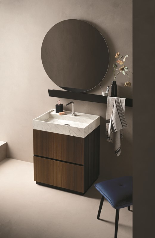La composizione Code03 di Arbi Arredobagno, con presa maniglia integrata e caratteristico taglio a 45° su fianchi e frontali, è contraddistinta da un mobile monoblocco in legno eucalipto opaco con lavabo Mantra in Laminam Statuarietto. La mensola Slide in alluminio Nero e la specchiera Light tonda con luce led perimetrale completano l’arredo.