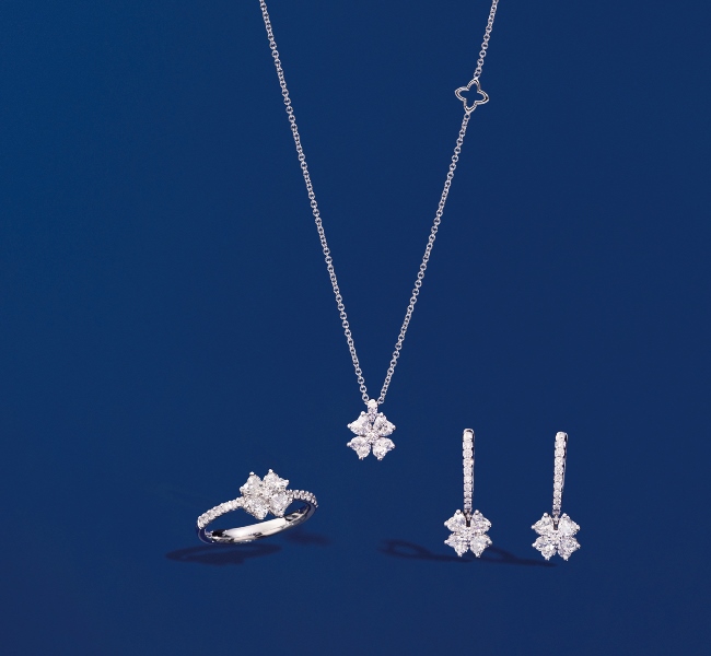 È un elogio alla natura quello di Recarlo per la nuova linea Quadrifoglio, il match ideale per uno stile romantico, giocoso e green. Cuori di diamanti selezionati in base ai più elevati standard qualitativi si trasformano in magici quadrifogli e prendono vita su una parure che si compone da girocollo, anello ed orecchini a monachella.