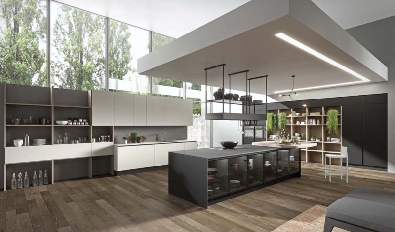 Il catalogo di Erika si arricchisce quindi di nuovi elementi trasformando il modello in un vero e proprio ‘sistema di arredo’, con soluzioni modulari e oltre 41 finiture per consentire ad ognuno di esprimere al meglio il proprio stile. Una composizione dal sapore minimal, pensata per agevolare i movimenti di chi la vive e garantire la massima ottimizzazione dello spazio senza rinunciare al design, prevede una grande isola polifunzionale, colonne e sistema a spalla. Per creare un gioco di volumi pieni e vuoti i grandi e capienti elementi contenitivi si alternano a moduli aperti, decorativi e subito accessibili. Le ante Jhon in alluminio nero con vetro fumé grigio alleggeriscono visivamente la struttura del blocco isola, dotato del nuovo Move-it snack: un piano mobile che scorre lungo la diagonale e che può fungere da tavolo da pranzo per poi essere riportato a filo dell’isola, limitandone l’ingombro. Ma la grande novità consiste nell’introduzione di elementi dalle linee morbide e circolari. La versione più sinuosa di Erika si caratterizza infatti per soluzioni creative ed ergonomiche: il disegno rigoroso delle colonne – con la nuova maniglia verticale – e i pensili abbinati alla libreria Fill si armonizzano con la penisola curva, le cui ante tondeggianti ne favoriscono una più comoda fruizione, donando alla composizione un aspetto avvolgente, quasi rassicurante.