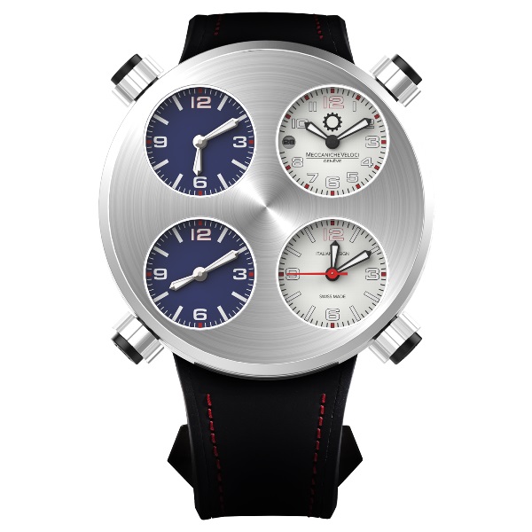 La passione per la tecnica e la bella orologeria, l’inesauribile ispirazione offerta dall’universo delle quattro ruote unite alla componentistica certificata 100% Swiss Made trovano una nuova originale espressione in questo segnatempo della collezione Icon. L’orologio Icon GranTurismo di Meccaniche Veloci si veste di un’eleganza sobria dal twist sportivo connotato dall’effetto bicolore dei quadranti. Il carattere bold dell’orologio trova eco nel concetto stesso di Gran Turismo, un’idea che ancora una volta trova ispirazione nell’universo delle auto sportive di pregio. La caratteristica cassa a forma di pistone di 49 millimetri del modello Icon GranTurismo è in titanio naturale spazzolato. I caratteristici quattro quadranti – che indicano altrettanti fusi orari – sono divisi in due “zone” per via dei due colori scelti, blu corsa e bianco, a ricordare la livrea delle auto sportive. L’audace effetto estetico diventa simbolo di un’elegante contrasto. Sui quadranti spiccano i dettagli rossi della lancetta dei secondi e delle ore 12 del quadrante principale che propone anche la finestrella per la lettura della data.