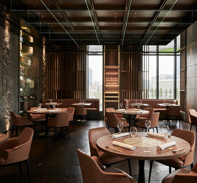 Inaugurato a novembre 2019, si trova al primo piano della Torre Solaria, nel distretto di Porta Nuova, luogo simbolo di una città sempre più cosmopolita, aperta e proiettata nel futuro. Da giugno 2020, IYO Aalto si evolve e diventa AALTO Part Of IYO. Già al timone di IYO Experience – l’unico ristorante di cucina giapponese con una stella Michelin in Italia – con il suo secondo ambizioso progetto Claudio Liu ha formulato un linguaggio gastronomico inedito. Progettato dall’architetto Maurizio Lai, lo spazio di AALTO Part Of IYO (320 mq) è coerente col pensiero di Claudio Liu e con la filosofia di cucina di chef Takeshi Iwai. Materiali naturali, legno di noce, porfido, ottone e pelle si combinano a elementi ad alto tasso tecnologico. Materia e superfici si compongono e si scompongono in un dinamismo continuo che però trova un equilibrio stabile tra visibile e invisibile. I tavoli in legno di noce, progettati per la sala, sono stati pensati come un’ordinata scacchiera. I tasselli a farfalla sulla loro superficie sono stati decorati in ottone per evidenziare bene le parti in legno del piano. Le forme in porfido si scompongono in porzioni geometriche e sono ricomposte attraverso decorazioni in ottone, che riproducono l’idea del kintsugi, l’arte giapponese di “riparare con l’oro”. Le scansioni del piano del tavolo, riunite in un intreccio unico e irripetibile di linee, hanno anche una funzione pratica, permettendo di trovare una posizione precisa per ogni oggetto della mise en place.
