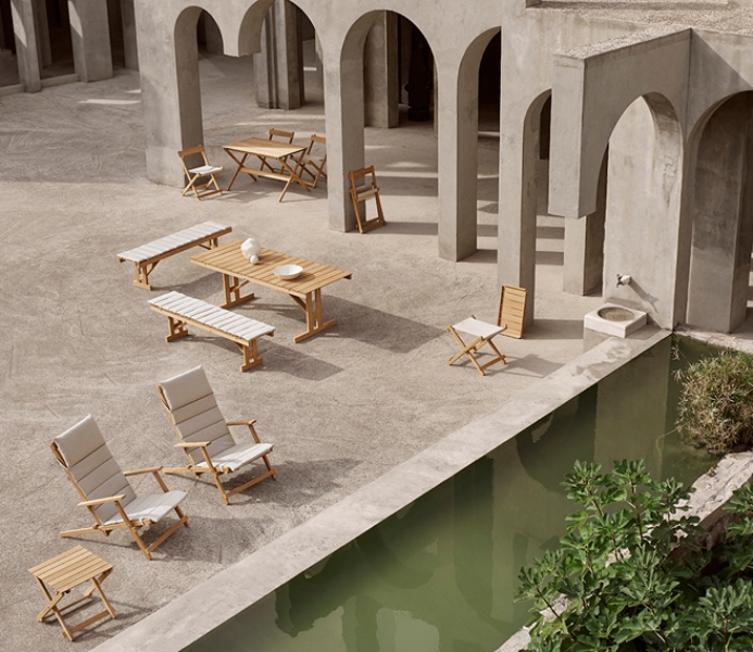 La collezione per esterno di Carl Hansen & Son si amplia con la serie Deck Chair disegnata da Børge Mogensen. La funzionalità rappresenta il tema centrale della serie Deck Chair di Mogensen, su cui ha lavorato per due anni, dal 1968 al 1970 – e che Carl Hansen & Son aggiungerà ora alla sua collezione di arredi per esterno. La serie Deck Chair è composta da una sedia a sdraio con cuscino e poggiapiedi, un tavolino, un vassoio, un tavolo da pranzo con sedie in coordinato e una struttura a parete. La collezione è stata originariamente progettata per rispondere alla necessità di Mogensen di una serie di arredi confortevoli, funzionali e salvaspazio per il balcone della sua casa di famiglia. Gli arredi, all’epoca realizzati in faggio e frassino non trattati, erano leggeri e pieghevoli. L’idea era quella di poter piegare e appendere gli arredi non utilizzati ad una struttura a parete pensata anche come elemento decorativo.