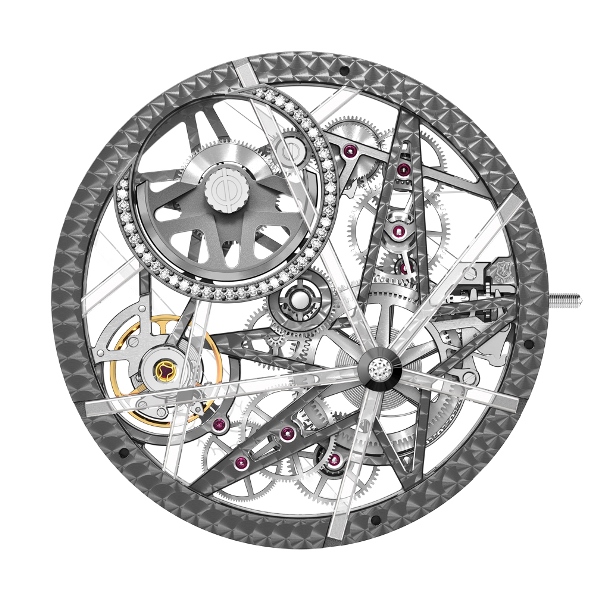 All’interno di questa costruzione affascinante, il movimento icona della Maison, ovvero l’ “Astral Skeleton” Roger Dubuis, è basato su una tecnologia innovativa che sfrutta microstrutture di vetro zaffiro sintetico identiche a quelle usate per i rubini degli orologi. La dimensione estetica e creativa – che Roger Dubuis ama chiamare “singolarità espressiva” – da cui il calibro è permeato crea l’impressione di una vera e propria scultura meccanica in 3D. Tale sensazione è rafforzata dalla proprietà di questo materiale di scintillare quando esposto ai raggi UV svelando il motivo che sembra fluttuare nella cassa, di notte. In una profusione finale di effetti ottenuti grazie al sapiente impiego della tecnologia, gli abili artigiani dei laboratori Roger Dubuis hanno incastonato il diamante al centro dell’Astral Skeleton in modo che risaltasse in tutto il suo splendore. Tale effetto strategico accentua ulteriormente le sue linee tese e la straordinaria profondità visiva che genera molteplici livelli e angoli.