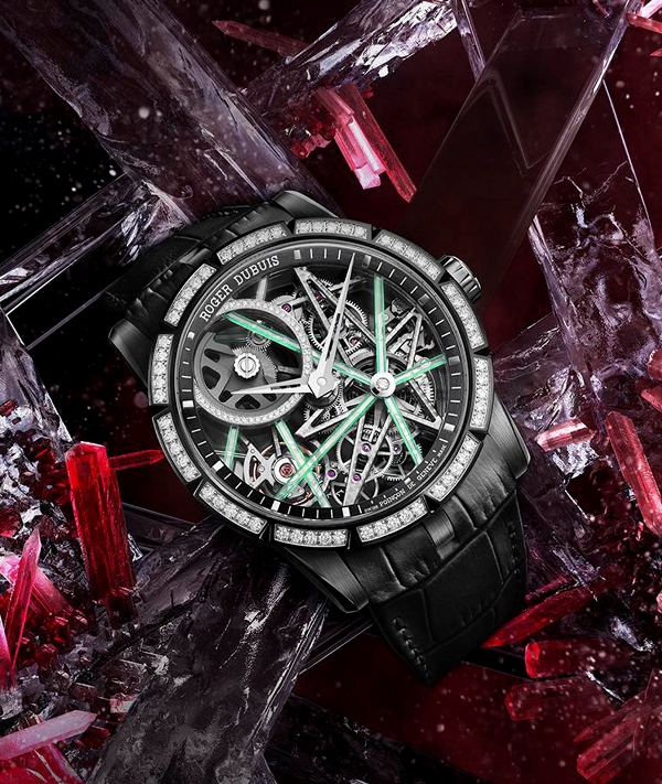 All’interno di questa costruzione affascinante, il movimento icona della Maison, ovvero l’ “Astral Skeleton” Roger Dubuis, è basato su una tecnologia innovativa che sfrutta microstrutture di vetro zaffiro sintetico identiche a quelle usate per i rubini degli orologi. La dimensione estetica e creativa – che Roger Dubuis ama chiamare “singolarità espressiva” – da cui il calibro è permeato crea l’impressione di una vera e propria scultura meccanica in 3D. Tale sensazione è rafforzata dalla proprietà di questo materiale di scintillare quando esposto ai raggi UV svelando il motivo che sembra fluttuare nella cassa, di notte. In una profusione finale di effetti ottenuti grazie al sapiente impiego della tecnologia, gli abili artigiani dei laboratori Roger Dubuis hanno incastonato il diamante al centro dell’Astral Skeleton in modo che risaltasse in tutto il suo splendore. Tale effetto strategico accentua ulteriormente le sue linee tese e la straordinaria profondità visiva che genera molteplici livelli e angoli.