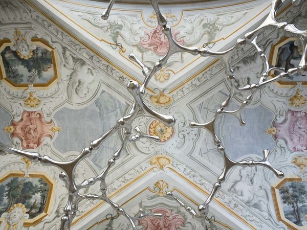 In mostra dall’8 settembre 2020 al 31 gennaio 2021, l’installazione Waterbones (177) fa parte di una serie di opere realizzate a partire dal 2009 nelle quali l’artista si concentra sullo studio e sull’indagine della struttura profonda della materia. Letteralmente ossa di acqua, l’opera è composta da moduli di acciaio inox che possono essere assemblati gli uni con gli altri in molteplici varianti. Un’opera che accoglie al suo interno duplice anima; è solida come una struttura ossea, ma allo stesso tempo è transitoria, fluida e modellabile come un flusso d’acqua. La superficie vibrante e monocroma di Aeolian Landforms (Dahkla 137C), invece, rimanda ai fenomeni di erosione dell’aria e dell’acqua: vibrazioni eccentriche si propagano sulla superficie dell’opera come le dune di sabbia si dispongono nel paesaggio naturale, saturando lo sguardo in un caldo colore giallo che pervade totalmente lo spazio dell’opera.