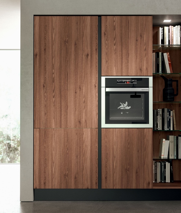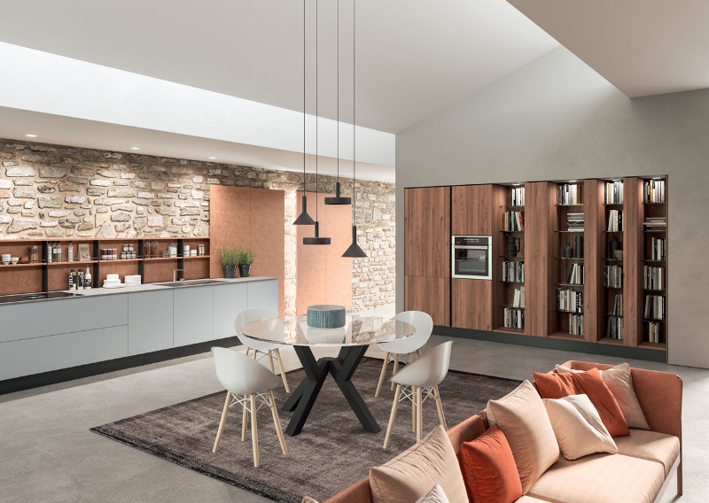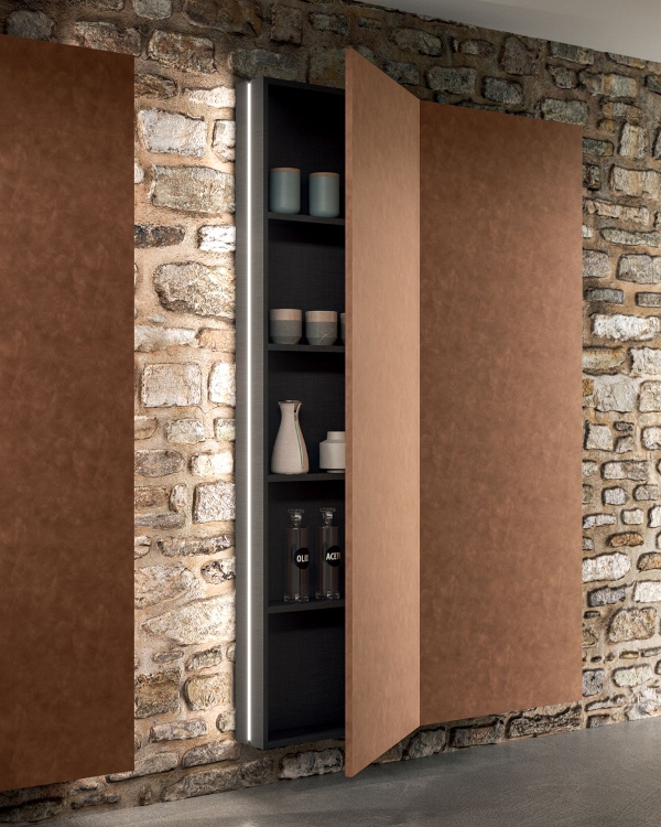 Tra le tante composizioni possibili spicca quella con basi in HPL grigio opaco, colonne in HPL Brown Larch e pensili in Corten Touch. Tonalità calde, naturali e pastello si armonizzano tra loro in un mix decisamente di tendenza, valorizzando le linee minimal della cucina. L’unità a parete, definita da moduli essenziali con ante push-pull, ospita il piano di lavoro in HPL stratificato argilla Cuore Colore, il lavello e il piano cottura. Lo schienale Copernico, proposto nella stessa finitura dei pensili e impreziosito da dettagli in alluminio nero, si rivela come pratica soluzione salva spazio per far posto a tutto ciò che è utile avere sempre a portata di mano. Ancora, le colonne ospitano gli elettrodomestici e una serie di mensole in vetro, ideali come eleganti ripiani a giorno. Ma l’elemento più innovativo è sicuramente il pensile: sviluppato in altezza e profondo solo 15 cm, con ripiani interni e sistema di illuminazione a LED, si caratterizza per l’anta aggettante, che sporgendo rispetto alla larghezza del mobile quasi ne cela la presenza, per un risultato estetico di forte impatto.