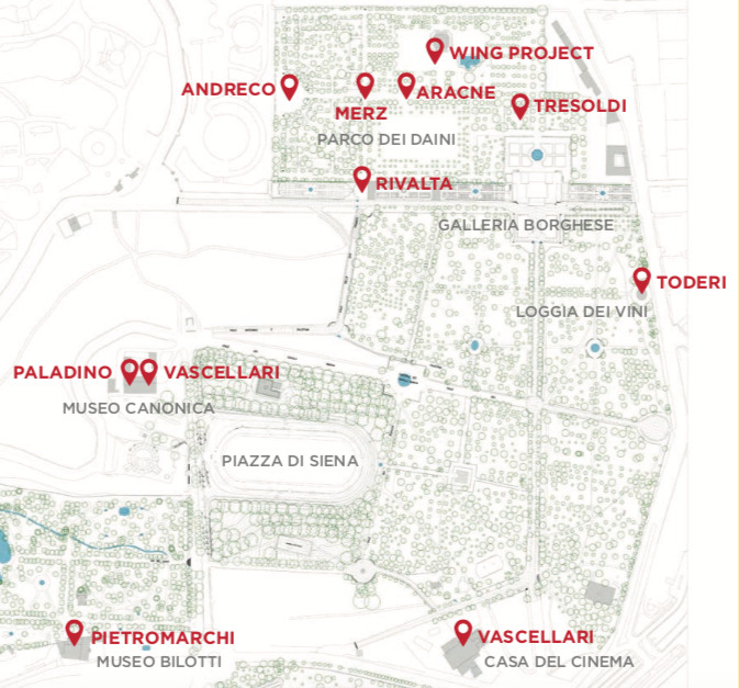 Andreco propone Drops, un’installazione originale che abiterà la Prospettiva del Teatro nel Parco dei Daini; Davide Rivalta espone, invece, una grande bufala in bronzo fusa con il metodo della cera persa, a dialogo con i leoni esposti sulla scalinata della Galleria Nazionale d’Arte Moderna e Contemporanea; Grazia Toderi interviene nella cosiddetta Loggia dei Vini, padiglione seicentesco al confine con Porta Pinciana, presentando la video installazione notturnaRed Map, a cura di Alessandra Mammì; Edoardo Tresoldi, impegnato per la prima volta in un’installazione pubblica a Roma, porta a Villa Borghese Etherea, una grande scultura trasparente e abitabile che dialogherà con gli alberi del Parco dei Daini.