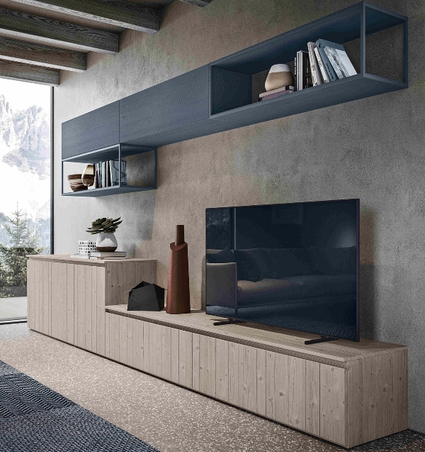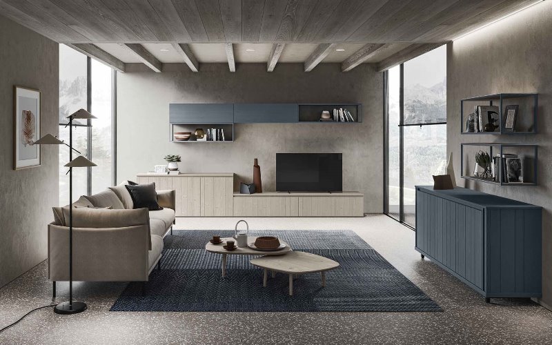 La finitura blu cobalto della madia e dei pensili a giorno, in netta contrapposizione con il tortora del mobile tv e dei tavolini, regala alla composizione quel tocco originale senza compromettere l’ariosità dell’ambiente. Un altro aspetto fondamentale è la selezione accurata dell’arredamento. La parete attrezzata è molto importante per poter dare spazio alla tv, ai complementi d’arredo e agli oggetti da riporre. Deve essere scelta con attenzione per poter sfruttare al meglio la metratura a disposizione. In questo caso Scandola Mobili propone delle basi chiuse a pavimento caratterizzate da diverse altezze per dare movimento alla composizione. Due pensili a giorno in ferro con ripiani in legno vanno a completare la parete con un tocco di colore.