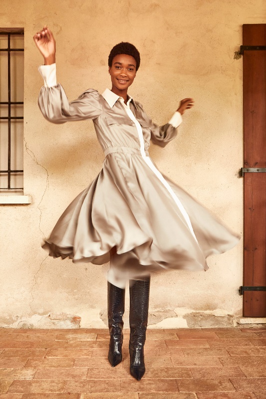 Il modello Firenze, iconico, rimane nella versione giorno in tinta unita e a pois bianchi e neri, ma la sera si trasforma in un raffinatissimo abito lungo di chiffon con una fantasia che mescola il grigio il rosa e il panna, i colori che ci danno energia, speranza e coraggio. Il nuovo modello Spoleto è bicolor, grigio perla e panna oppure nero e rosa cipria con collo e polsi a contrasto, decisamente chic.