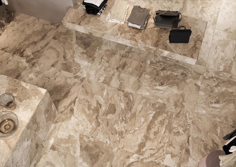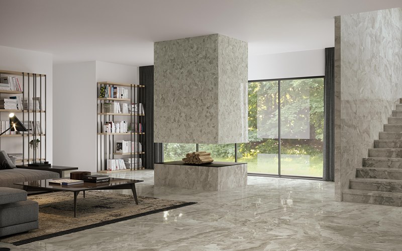 La collezione Kamu rivela una spazialità fluida e continua, giocata sulla brillantezza delle superfici e su raffinati giochi cromatici. Il fascino antico del marmo si contamina con una delle ultime tendenze dell’haute couture: un dirompente camouflage che emerge dalle superfici lucide in gres porcellanato. Quando la luce si specchia sulle lussuose lastre, il risultato è una bellezza radiosa che evoca sensazioni quasi liquide.
