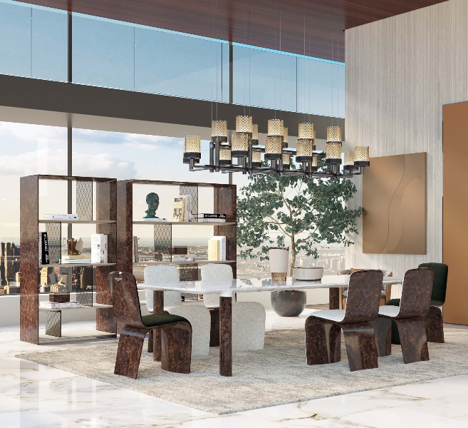 Le curve eleganti della sedia Ridley by Bentley Home sono enfatizzate dal taglio smussato del telaio rivestito in essenza. Il codice distintivo della collezione, qui nella versione Smoked Liquidambar, viene così raccontato nella sua forma più iconica.