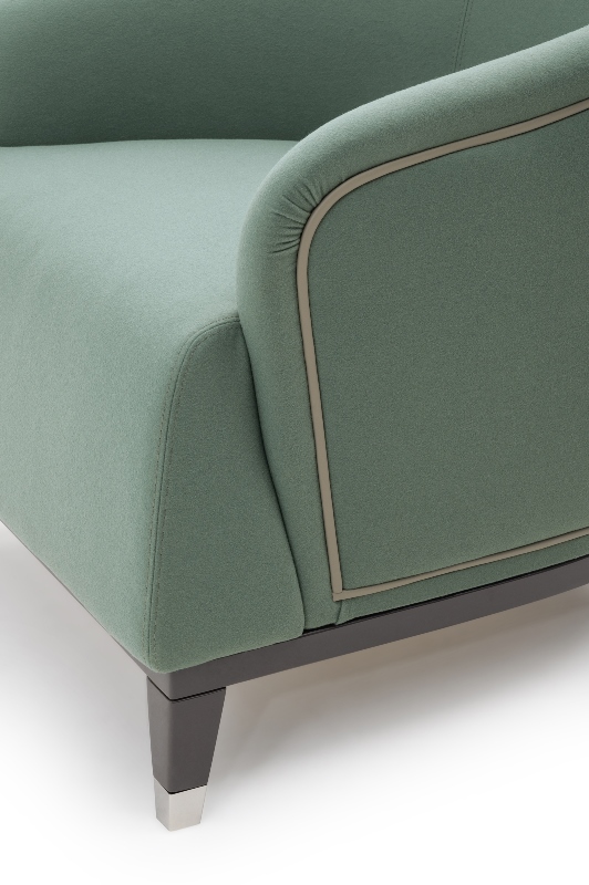 Jolly, la poltroncina con struttura in legno lucido color caffè e inserti in metallo oro chiaro, è proposta nella versione in tessuto di lana Tiepolo in tonalità Lovat, sempre Loro Piana Interiors. Qui la delicata sfumatura del rivestimento è interrotta solo da un profilo in pelle beige, applicato da Turri. La particolare conformazione della seduta, in cui lo schienale circonda la base fino a formare anche i braccioli, rende Jolly già comoda e accogliente; la preziosità del tessuto la trasforma in una poltrona esclusiva, sulla quale ci si sente avvolti e coccolati. Con questa sofisticata versione delle poltrone Vine e Jolly Turri conferma la sua capacità di cogliere le necessità del mercato e lavorare instancabilmente sulla scelta dei migliori materiali possibili. Vivere nella bellezza, in fondo, significa anche circondarsi di piccoli e grandi lussi.