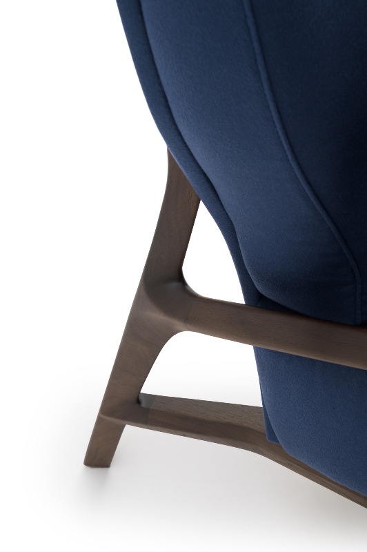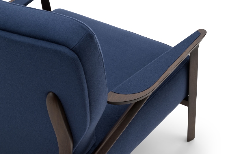 La poltroncina Vine, disegnata da Frank Jiang, stupiva già per la complessa lavorazione della struttura in legno; ispirata ai tralci di vite, sottile e leggera, in noce scuro, sostiene un ampio schienale e una profonda seduta, i cui imbottiti sono ora rivestiti con il magnifico tessuto Loro Piana Interiors Sherpas in puro Cashmere nel colore Faded Blu. La texture, calda e morbida, quasi impalpabile, invita a concedersi un momento di puro benessere, lasciando immaginare come luogo ideale per la poltroncina un accogliente salotto di montagna o un ricercato ambiente cittadino. Lo stesso rivestimento è stato scelto anche per i cuscini a complemento del divano Vine: dettagli preziosi su un elemento d’arredo dal design moderno e confortevole.