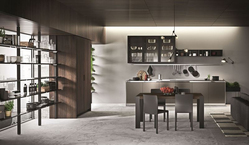 Ne è un esempio la composizione con unità a parete che si snoda lungo sei moduli con ante in finitura metallo liquido piombo; queste, completamente lisce e con apertura con gola, si caratterizzano per la particolarità del colore, ricco e pieno, e creano un sottile gioco di contrasti con le ante dei pensili, in vetro tessuto scuro e telaio in alluminio nero. Ad arricchire le linee minimal delle basi, ecco i moduli a giorno e gli accessori in acciaio, che insieme al top, agli zoccoli e ai laterali dei moduli illuminano tutta la composizione. Oltre a dare un tocco professionale, quasi industriale, il canale attrezzabile sul piano di lavoro e la barra a parete sono anche pratiche soluzioni per far posto a utensili, strumenti ed ingredienti da avere sempre a portata di mano.