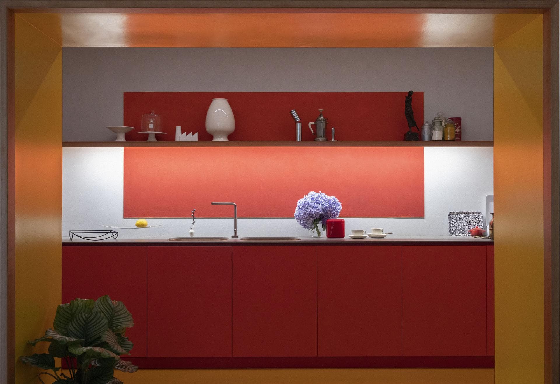 “Anche se personalmente cucino raramente, mi piace il buon cibo. Persone creative intorno a me danno vita nelle loro cucine a manufatti commestibili che, oltre ad avere buon sapore, hanno le caratteristiche estetiche di un’opera d’arte; materiali come ingredienti la cui preparazione ha bisogno di buona maestria per un cliente molto esigente. Come sono io. “GP kitchen” è stata concepita come il regno dei colori. Lo spazio è come un dipinto di Rothko incorniciato, appeso alla parete della sala da pranzo che ti permette di entrare nelle sue viscere. “Orange and Yellow”, il suo famoso dipinto, era la scelta migliore ed ha ispirato la tavolozza colore. Con l’aiuto delle speciali finiture di Quadrodesign, siamo stati in grado di incorporare anche il rubinetto che è diventato parte del dipinto…” Ron Gilad