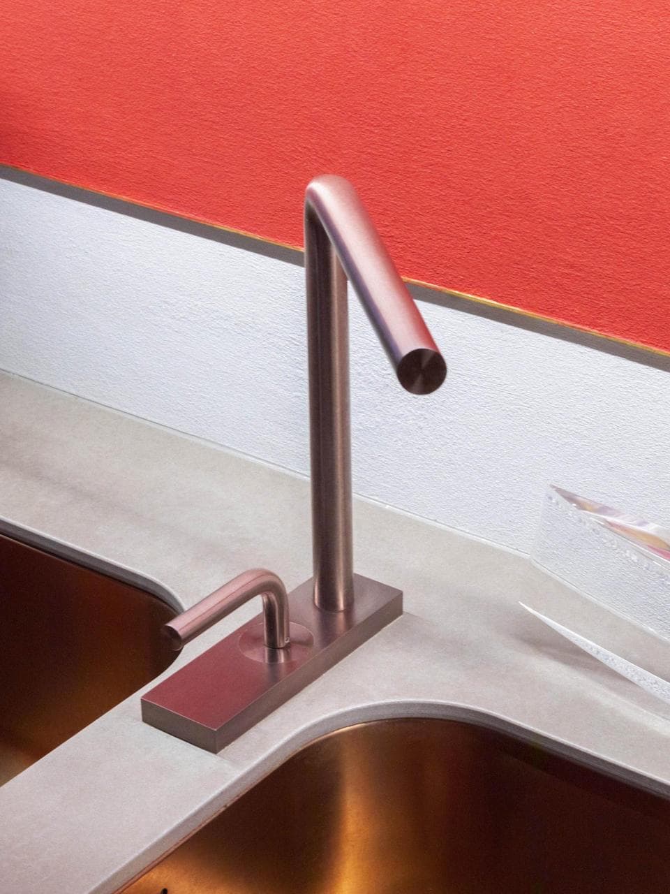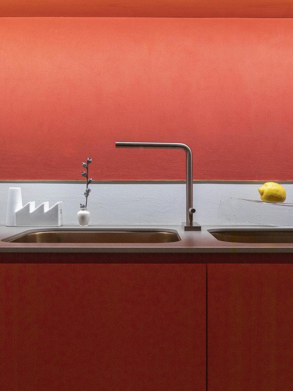 Per la cucina è stato scelto il rubinetto Levo: una serie in acciaio inossidabile AISI316L. La sua forma e funzionalità sono ridotte al minimo, trasformando il prodotto in un elemento d’arredo essenziale e senza tempo. Il semplice – ma tecnicamente avanzato – movimento di attivazione, rappresenta, nella sua forma più pura, le fondamenta della serie e del prodotto stesso. Nel rispetto della filosofia del brand, Levo è stato disegnato nel rispetto dell’ambiente. La cartuccia progressiva riduce l’utilizzo della caldaia, l’aeratore aiuta a ridurre il flusso dell’acqua e l’acciaio inossidabile AISI316L è un materiale completamente riciclabile, atossico e resistente agli attacchi di acqua salina.