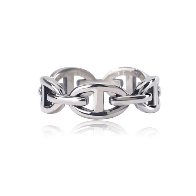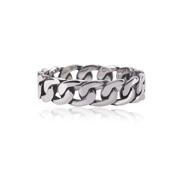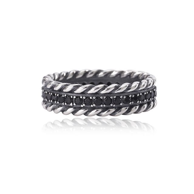 Il set si completa con tre anelli nello stesso stile (4, 6, 7 mm di spessore) disponibili in 5 misure. La collezione di anelli si racconta anche attraverso altre lavorazioni dell’argento, come la maglia traversino, la lavorazione torchon e torchon con zirconi neri, oppure lo spigato.