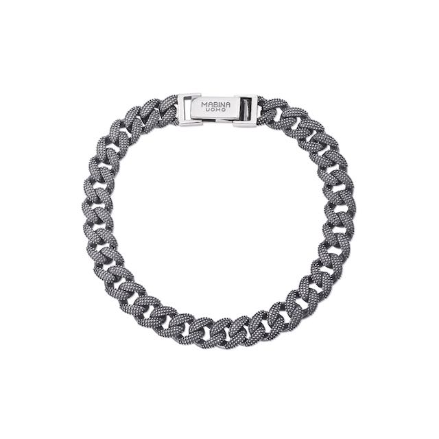 La groumette rigata introduce un nuovo tema estetico che stravolge il design del bracciale MABINA UOMO di 7 mm di spessore declinato in due taglie (S,M). Tra le collane, spiccano i girocollo (50 cm) con piastrina che decorano una catena groumette sottile. I ciondoli sono proposti in due versioni, argento 925 brunito e pavé di zirconi neri, oppure argento 925 brunito con un motivo a rombi intrecciati inciso.