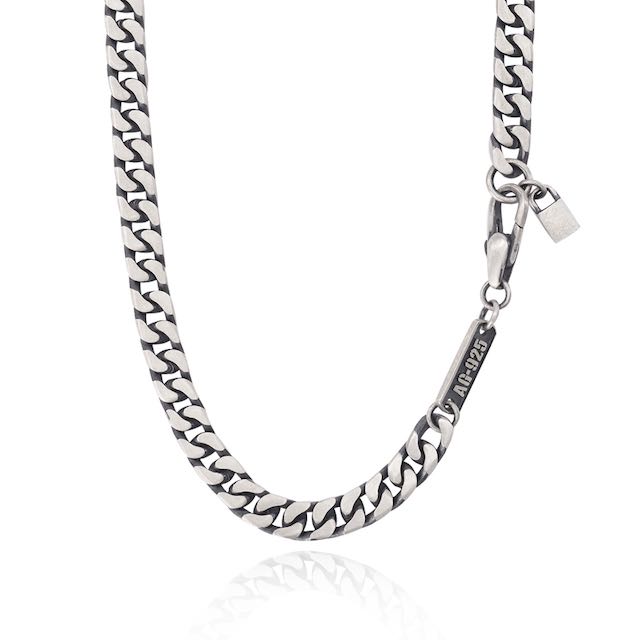 La maglia groumette, in differenti declinazioni, è tra le grandi protagoniste della prima collezione MABINA UOMO. Bracciali, collane, anelli sono presenti con diverse lavorazioni, dalla maglia liscia, alla maglia borchiata oppure rigata. Tutti i gioielli sono d’argento 925 brunito. I bracciali presentano una chiusura brevettata a pinza con molla. I bracciali di catena groumette liscia sono disponibili in due volumi (6, 7 mm) e due taglie (S, M) ciascuno. La lavorazione vintage mette in valore luci e ombre del metallo valorizzando la tridimensionalità dei bracciali.