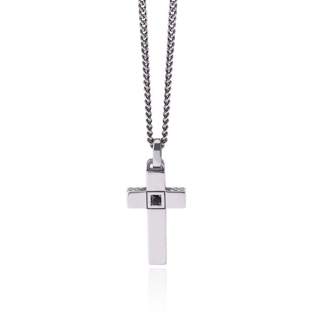 Il fascino degli zirconi neri anima le collane con ciondolo a forma di croce. Su una catena groumette sottile si possono scegliere tre diversi tipi di croce, d’argento con zircone nero al centro; la croce interamente di zirconi neri; la croce con doppia fila di zirconi neri che ne accentuano le linee geometriche.