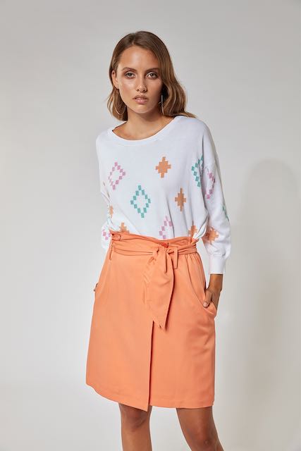 Punto focale della collezione è l’arte del ricamo, orgogliosamente realizzata a mano in Italia, che si manifesta in tutta la sua bellezza e preziosità con il “punto diamante”. Un ricamo realizzato a intarsio con disegno geometrico la cui forma richiama per l’appunto quella del diamante e prende ispirazione dalle antiche stampe Ikat.
