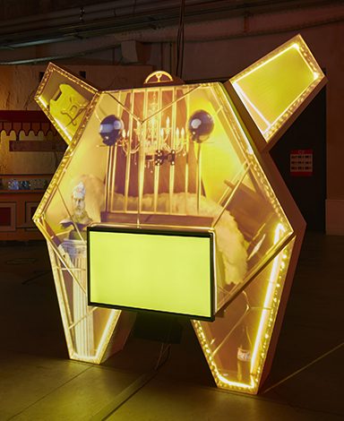 Lo spazio, che emula lo scenario di un parco divertimenti, accoglie un’ampia selezione di opere che include le più rilevanti installazioni e sculture di Neïl Beloufa. Tuttavia, analogamente a quanto accade oggi, la fruizione delle attrazioni non è consentita e la mostra sembra prendere vita unicamente in risposta a una serie di voci narranti che guidano lo spettatore.