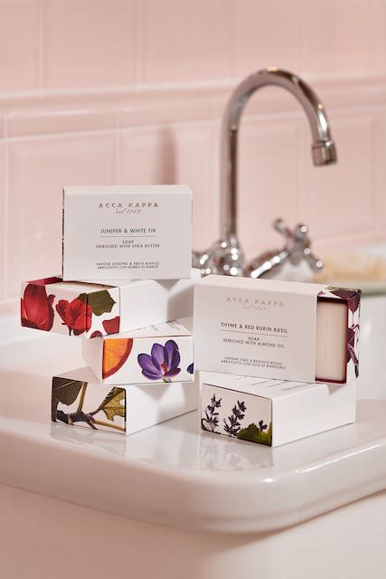 I nuovi principi attivi dei saponi Acca Kappa caratterizzano le diverse fragranze: il sapone Fico Bianco & Miele dalle proprietà emollienti e restitutive per mani secche e screpolate; il sapone Timo & Basilico Rosso con Olio di Mandorle Dolci che addolcisce e nutre contrastando l’invecchiamento della pelle; Ginepro & Abete Bianco con Burro di Karitè che lenisce e idrata; Lavanda & Fiori di Tiglio con Amido di Mais per rinfrescare e donare morbidezza; Rosa Mosqueta & Geranio che, grazie alle proprietà antiossidanti, rigenera e offre un’azione anti-age alle pelli secche e mature; Arancia & Zafferano con Olio di Germe di Grano per un’azione restitutiva, elasticizzate, antiossidante.