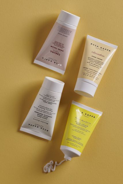 Dalle quattro fragranze esclusive Acca Kappa sono nate le formulazioni hand-care: la crema Muschio Bianco idratante e lenitiva con estratti di Magnolia, Viola tricolor e Mora per un trattamento intensivo; la crema mani lenitiva Green Mandarin con estratti di Tè Verde e Mandarino dalla texture ultra-leggera e l’assorbimento ultra-rapido; la crema Sakura Tokio con Acido Glicolico e Acido Mandelico ad azione schiarente sulle macchie cutanee e la crema mani Calycanthus con Olio di Girasole e Olio di semi di Lino, dalla texture setosa che si assorbe in un attimo.