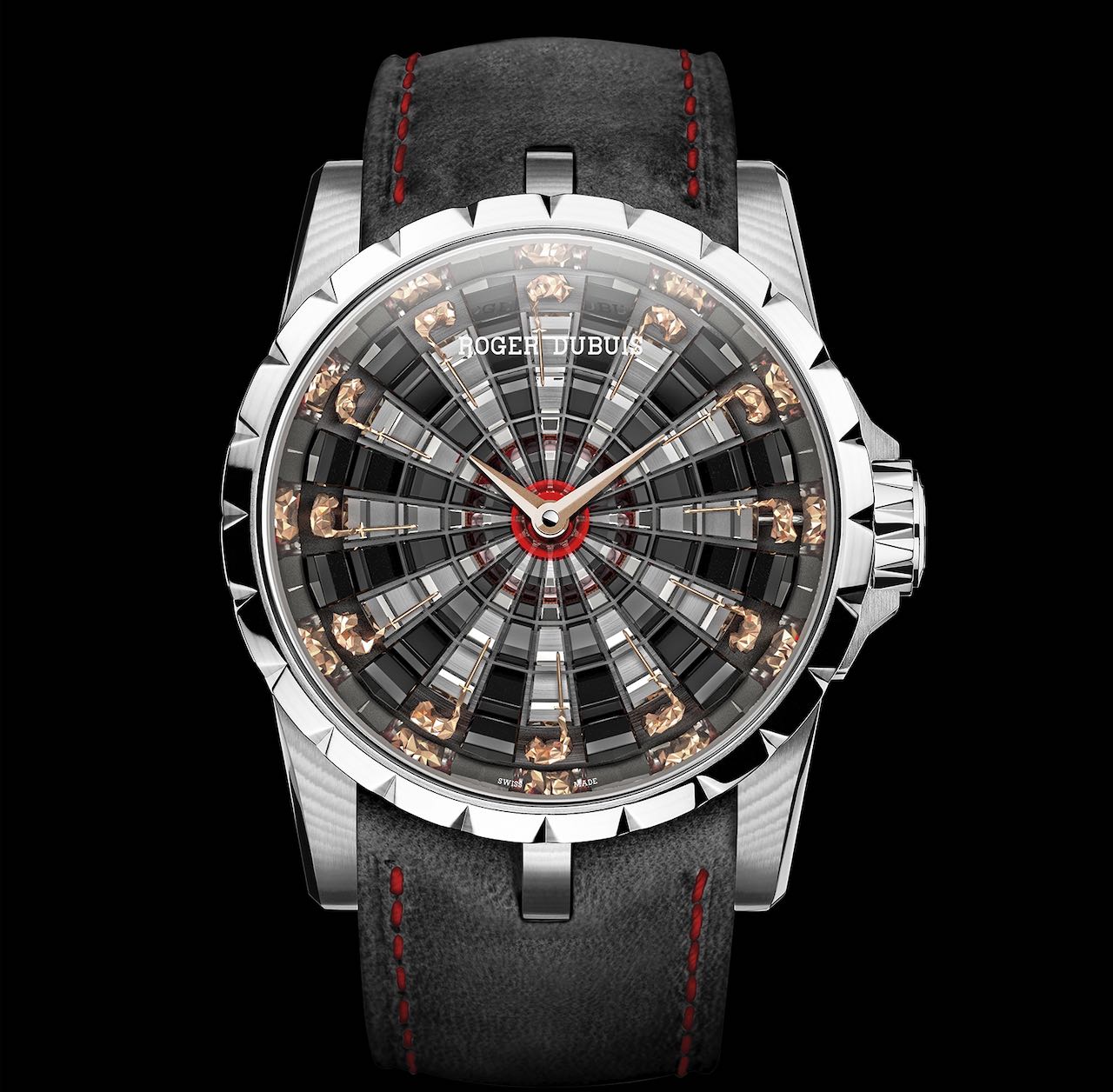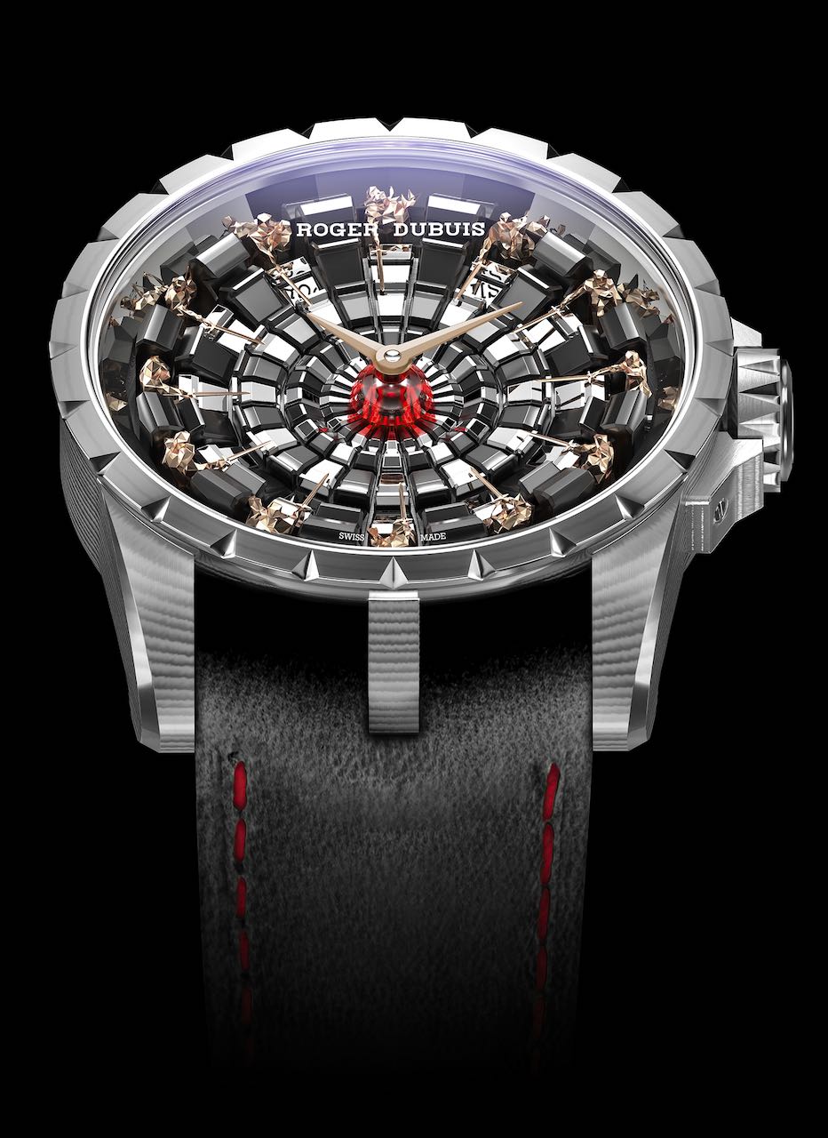 L’avventura prosegue con un quadrante 3D caratterizzato da uno straordinario concentrato di abilità artigianali, inclusa una sorprendente combinazione di smalto grigio scuro, oro bianco e vetro di Murano. La struttura del quadrante è composta da oro bianco e smalto grigio scuro, il che crea lo sfondo perfetto per le piccole sagome scolpite a mano dei Cavalieri della Tavola rotonda. Ogni cavaliere, stampato in oro rosa e alto appena 7 mm, è meticolosamente scolpito, inciso e rifinito a mano. I cavalieri rappresentano degli eccezionali esempi di Low Poly Art, una tecnica unica in cui sculture e dipinti sono composti unendo una miriade di poligoni. Ogni cavaliere, con la spada sguainata, è posizionato in corrispondenza di un’ora, mentre sul fondello è inciso il famoso giuramento di fedeltà verso Re Artù. Totalmente fedele alla sua ricerca dell’edonismo, dell’eccentricità e della libertà da condividere con una tribù scelta di suoi estimatori, Roger Dubuis sorprende nuovamente dimostrando ancora una volta una straordinaria padronanza tecnica unita a un’artigianalità leggendaria.