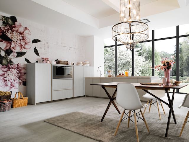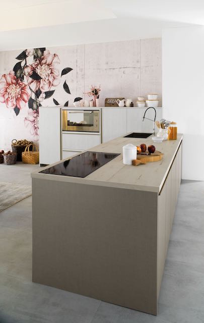 Le forme estremamente essenziali e geometriche sono addolcite dai toni caldi e tenui delle ante: in finitura Penelope quelle dei moduli dell’isola, in frassino Hielo quelle dell’unità a parete. Proprio le ante, completamente lisce, definiscono il carattere minimal della cucina; le maniglie in metallo, dal design lineare, sono un elemento decorativo e al tempo stesso funzionale: applicate sui pannelli in verticale o in orizzontale, hanno una gola interna invisibile che ne facilita le presa.