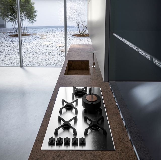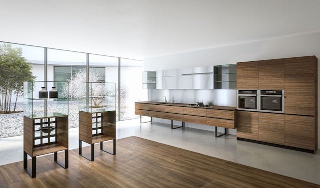 Makio Hasuike, Compasso d’Oro alla Carriera, ha collaborato con il team Ricerca e Sviluppo di ARAN Cucine per realizzare Sipario, il modello diventato ormai ‘ideale’ di ordine e razionalità tra le tante proposte a catalogo dell’azienda. Già al primo sguardo, infatti, la cucina riesce a trasmettere l’essenza del design giapponese grazie alla sua immagine armonica, ordinata ed essenziale. Privilegiando dunque uno spazio razionale, in cui tutti gli elementi siano in equilibrio tra loro, Sipario si sviluppa in configurazioni sempre lineari, minimal, funzionali. È l’accostamento tra moduli e materiali diversi a consentire un ampio margine di personalizzazione, fino ad arrivare addirittura ad un possibile connubio tra stile classico e contemporaneo. Ne è un esempio la versione con ante in noce canaletto chiaro e pensili in acciaio e cristallo. L’abito tradizionale del legno veste moduli estremamente essenziali: molto particolari quelli delle basi, perché sospesi, più classici quelle delle colonne, ampie e capienti, accessoriabili con ripiani interni ed elettrodomestici. I pensili si compongono di vani a giorno in cristallo e di un grande modulo dotato di un’unica anta in acciaio: