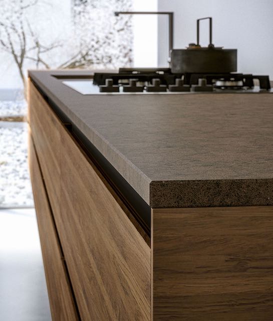 grazie ai numerosi bracci di sostegno e alla leggerezza del materiale, basta un semplice tocco per attivare il meccanismo che ne accompagna l’apertura e la chiusura. Interessanti anche i totem, elementi modulari free standing configurabili secondo necessità, sorretti da una struttura in metallo testa di moro (la stessa finitura scelta per zoccoli, gole e piedi delle basi); anche in questo caso, per il vano contenitivo, si gioca sull’accostamento tra legno e cristallo, in equilibrio tra densità e materiali diversi.