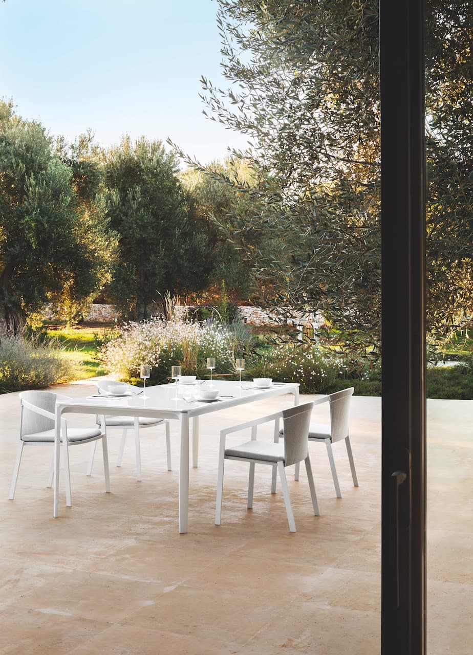 Linee pulite e design minimalista caratterizzano questo tavolo da pranzo elegante e al contempo pratico. Push è infatti disponibile come pezzo unico da 220 cm di lunghezza, oppure nella versione allungabile fino a 318 cm, perfetta per accogliere compagnie di amici e famiglie numerose in totale comodità. La solida struttura in alluminio verniciato può essere abbinata ad un top in gres nella versione allungabile, mentre in quella fissa è possibile optare anche per un top in hpl.
