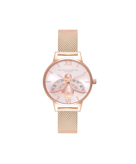 Ispirandosi alle meraviglie della natura, forza generatrice di tutte le cose, il brand di orologeria Olivia Burton (marchio londinese di orologeria, gioielleria e accessori) dà vita a tre nuovi segnatempo della linea 3D Bee. Piccole api tridimensionali diventano le protagoniste assolute di orologi unici e dal carattere bucolico. Sul quadrante di colore grigio del segnatempo Lucky Bee spicca il motivo a forma di ape. La cassa rotonda del diametro di 34 mm è in acciaio inossidabile con placcatura in oro rosa, come il cinturino in maglia milanese, gli indici e le lancette. A ore sei e ore dodici campeggiano le rispettive cifre romane, le restanti ore sono indicate dagli indici.