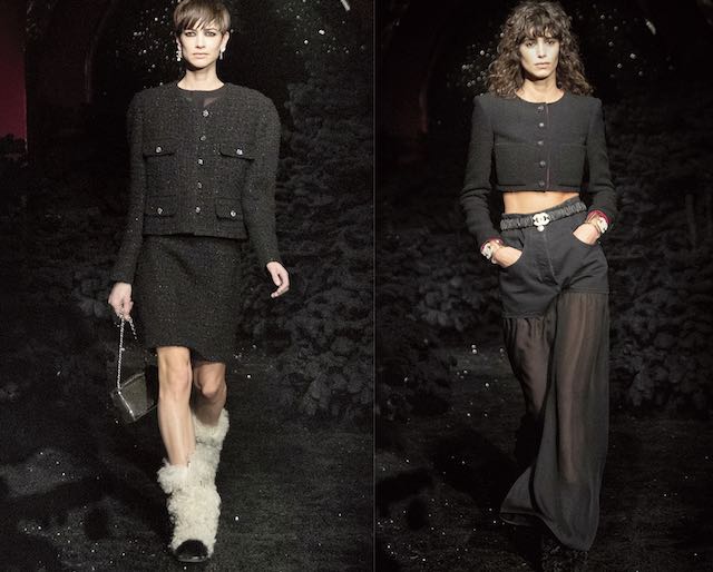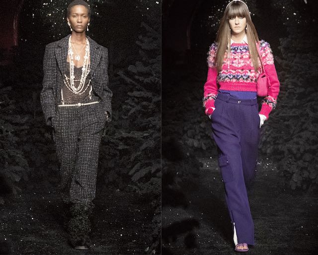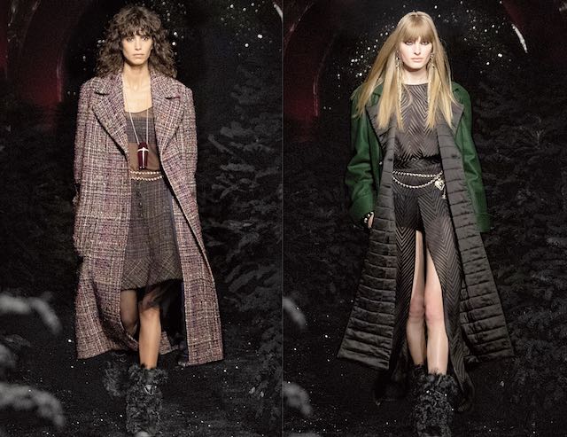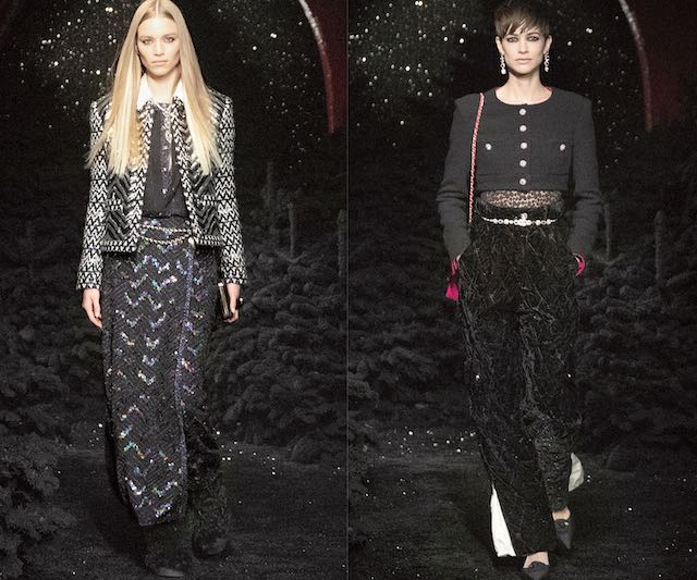 La collezione gioca con i contrasti tanto amati da Virginie Viard. Contrasti tra volumi, materiali e spirito. Un lungo cappotto di tweed con motivo chevron rivela gambe nude che indossano stivali voluminosi in ecopelliccia riccia nera; un tailleur pantalone in tweed nero a quadretti in lurex blu è adornato da bretelle sottili in perle e strati di collane sautoir. Un cappotto bianco di montone verniciato e foderato di ecopelliccia, è abbinato a stivali bicolore stile “piumino”, con gambe non zip che lasciano il posto a un paio di stivaletti con tacco argento per andare a ballare. Le salopettes-tute da sci in trapuntatura bianca ricamato con motivi rossi e blu, o in tweed fucsia, “Questa collezione è un mix di due influenze: l’atmosfera delle vacanze sulla neve, che adoro, e una certa idea di cool chic parigino, dagli anni ’70 ad oggi.”