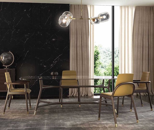 Le sedie imbottite Joyce, realizzate con una struttura in legno di frassino, possono essere personalizzate nel rivestimento rendendole un complemento assolutamente versatile. Il tavolo Joyce con struttura in legno dalle linee geometriche è disponibile nella dimensione ovale o tonda con piano in vetro e dettagli dei piedini in ottone. A completare la proposta living Morelato presenta il comò Joyce in legno di frassino con piano in marmo, tre pratici cassetti a scomparsa e due ante scorrevoli laterali con maniglie in ottone e un ripiano interno. I piedini sono sagomati con dettagli in ottone.