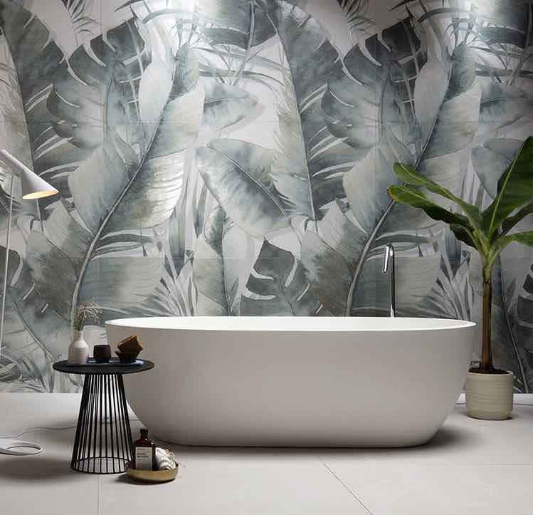 FAP ceramiche, azienda tra i maggiori produttori di rivestimenti del settore ceramico, ha riprodotto sulle superfici numerose sfumature green, rigogliosi motivi vegetali e fantasie tropicali come inno alla natura. Spazio quindi agli intrecci di diverse tipologie di piante, foglie e fiori disegnati in maniera dettagliata, o stilizzati dal forte impatto visivo ed emozionale. Tra le linee in pasta bianca di FAP ceramiche, ben rappresentano questo mood i decori di Bloom, Nux, Sheer e la novità Summer.