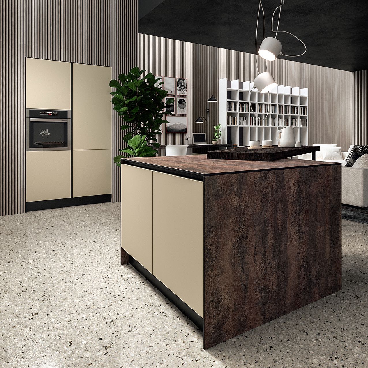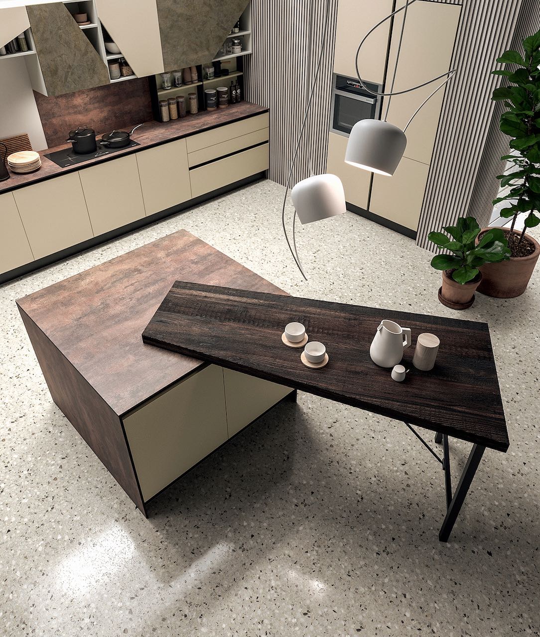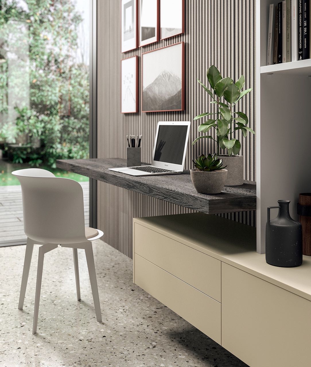 Una delle composizioni sorprende per l’accostamento tra superfici lisce e superfici lavorate (con la finitura sabbia delle basi e delle colonne abbinata, sui pensili, a quella Vesuvio effetto malta, dalla texture materica) e tra linee rette e linee oblique. Oltre all’unità a parete, lo spazio contenitivo e di lavoro si estende ad una piccola isola, sostegno per un tavolo snack asimmetrico in E-wood abete nero. Proprio questa finitura torna su un elemento estremamente funzionale: un lungo e solido ripiano integrato alla composizione di mobili coordinati della parete living, che all’occorrenza si trasforma in una comoda e discreta postazione home office.