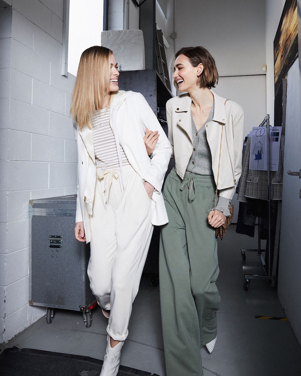 Vero protagonista un guardaroba trasversale composto da capi sempre più versatili nelle silhouette ma sempre e comunque glam. Must di stagione il nuovo athleisure dall’appeal sartoriale; ne è esempio perfetto la tuta taglio active di jersey ma con scenografici cristalli luminosi a profilare maniche e colletto. Perfette 24/7 con capi Urban Chic, da scegliere tra il classico tailleur passe-partout ma di lurex jacquard su top con applicazioni effetto piume, o la chemise femminile su pantaloni stretch. Fluide le consistenze della combo blusa di cady stretch con nastro di raso su panta a palazzo con banda laterale in un delicato color glicine, come l’abito a tubino con scollo a V; per una Spring Attitude a tinte pastello. Timeless il tutto nero, colore imprescindibile e sinonimo dell’eleganza per eccellenza, ideale per little black dress di cady stretch con intarsi cutout o in twill spalmato, swan dress in fil coupé effetto piume e profondo scollo a V, o il nuovo tuxedo composto da giacca sartoriale senza maniche con revers di raso su pantaloni a palazzo. Motivi Smart couture è soprattutto una questione di Elegance, che si esprime anche attraverso giochi d’intreccio in bianco e nero per giacchine bon chic bon genre, avvitate e bouclé, da abbinare in piena libertà. Tanto il denim, nuovo tessuto passe-partout per i Daywear di nuova concezione, tra classici jeans cinque tasche e gonne a matita.