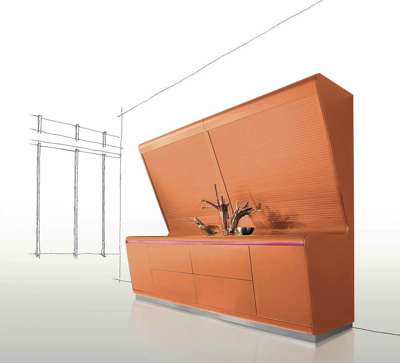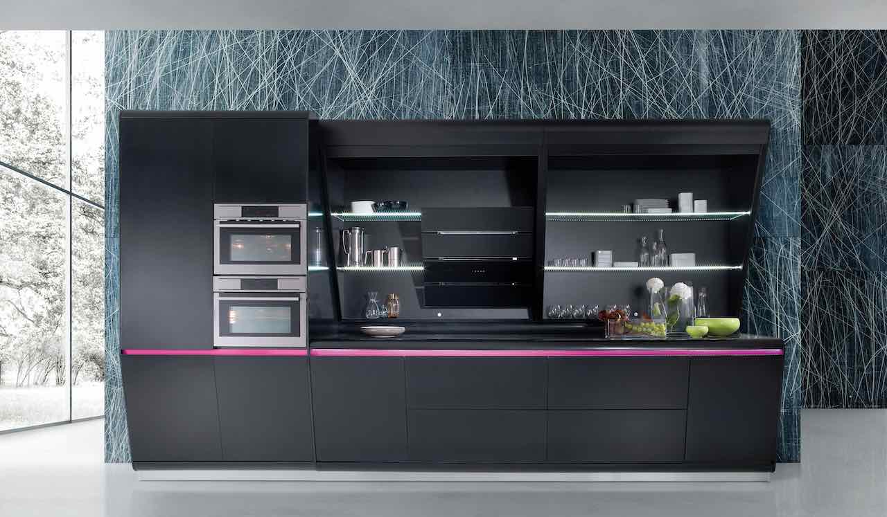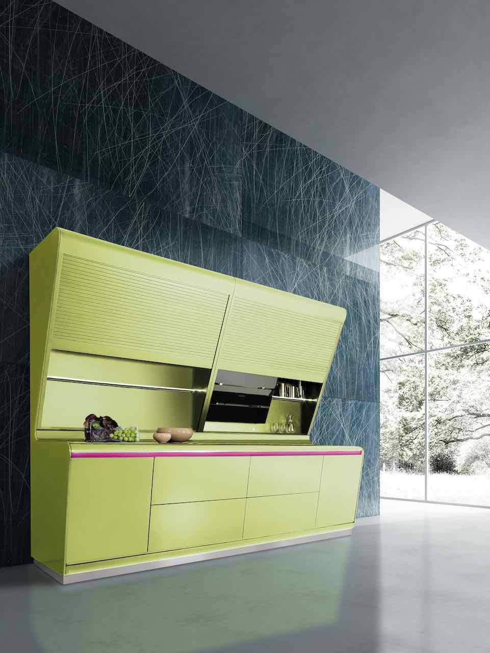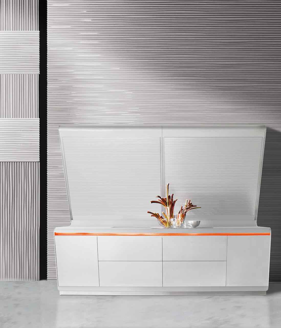 Celeste, bianco, lime, arancio, melanzana e dettagli a contrasto: questa la palette scelta per portare energia e vitalità in cucina. Configurata come un monoblocco a parete, Kook sorprende non solo per l’impatto visivo, ma anche per l’ergonomia e la funzionalità. Inoltre, grazie alla scelta del Solid Surface, gli elementi di discontinuità sono quasi inesistenti: ogni accessorio o strumento di lavoro può essere infatti ‘mimetizzato’ con discrezione all’interno della stessa cucina, lasciando ordinata e inalterata l’estetica del progetto. Serrande motorizzate celano i pensili rastremati, organizzati internamente con ripiani in vetro e luci LED. I moduli base, anch’essi ‘inclinati’, permettono di muoversi più agilmente davanti al piano di lavoro senza rinunciare allo spazio; la loro massima profondità, infatti, equivale a quella del top, di 90 cm: una dimensione che permette di integrarvi facilmente piano cottura e lavello. Quest’ultimo, realizzato sempre in Solid Surface e con miscelatore a scomparsa, può essere nascosto sotto un tagliere removibile che aumenta lo spazio di appoggio. Per aprire le ante con profilo gola colorato a contrasto, dotate del sistema Servo Drive, basta un semplice tocco, e ogni gesto diventa immediato grazie alla possibilità di aggiungere alla composizione anche ulteriori colonne in cui incassare gli elettrodomestici.