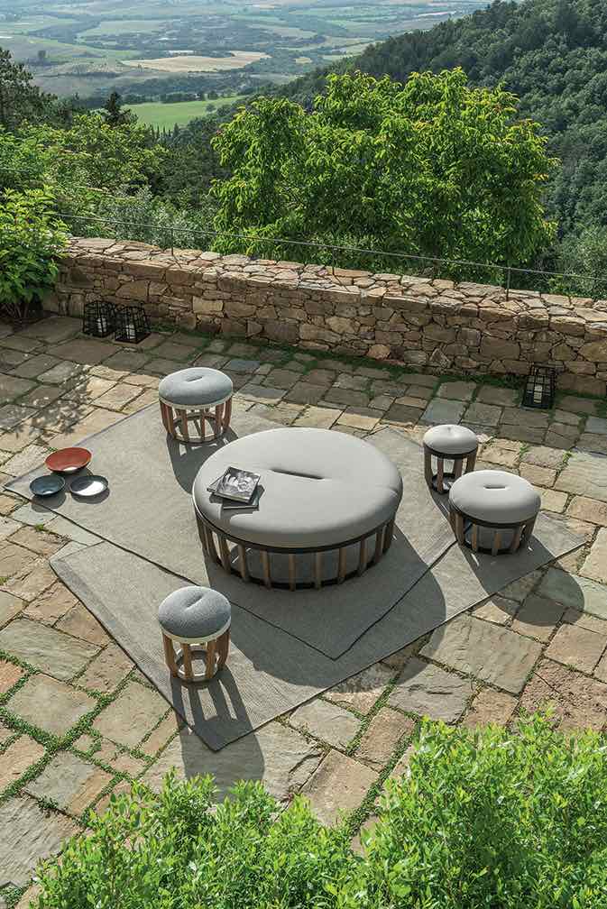 I tessuti della soffice imbottitura, realizzati in materiali tecnici per resistere alle condizioni atmosferiche e all’usura nel tempo, sono disponibili nei colori Nature Grey, Chess, Green Sardinia e Blu INK.
