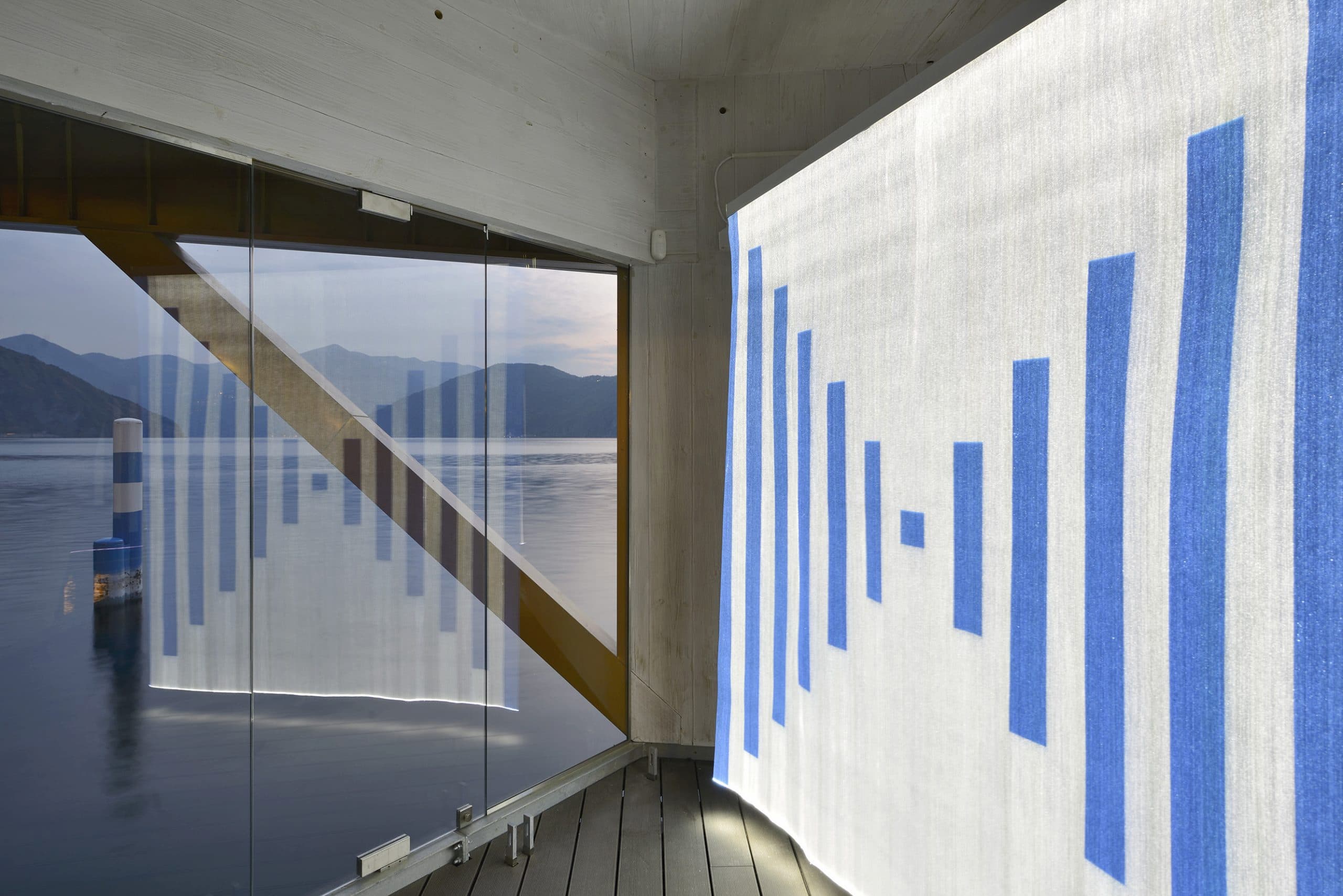 Primo artista accolto nei suggestivi spazi sul lago è, appunto, Daniel Buren che ha allestito quattro teli in fibra luminosa, visbili fino al 30 settembre 2021.