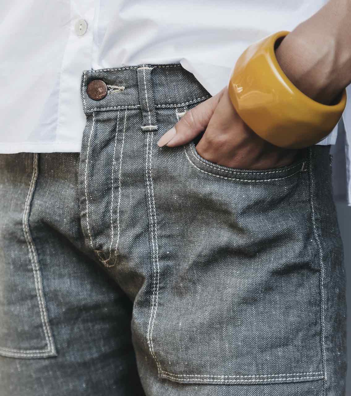 Hanno i fianchi tipicamente maschili, dritti, un po’ scesi, ma volumi gentili, arricchiti dalle tipiche tasche applicate sul davanti che diventano elemento decorativo e pratico nascondiglio. Sono stati concepiti in tre varianti: blue denim in cotone, grigio “rinse” e bianco “dyed” in cotone e lino, con una piccola percentuale di elastomeri che regala un fit ineccepibile.