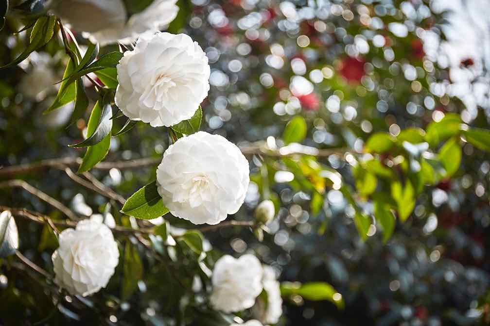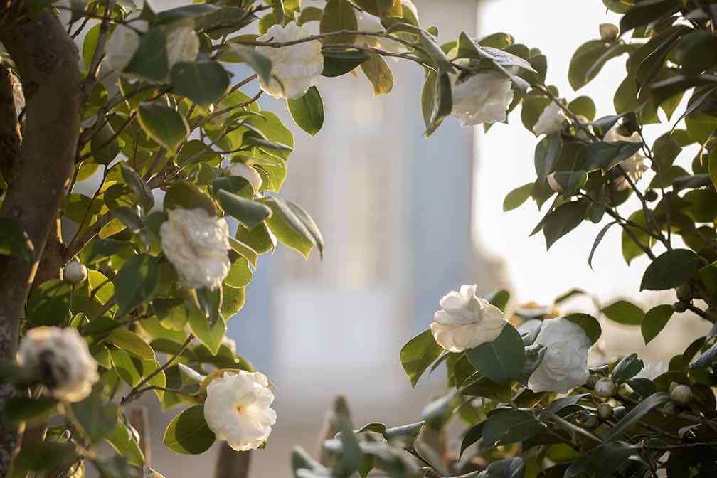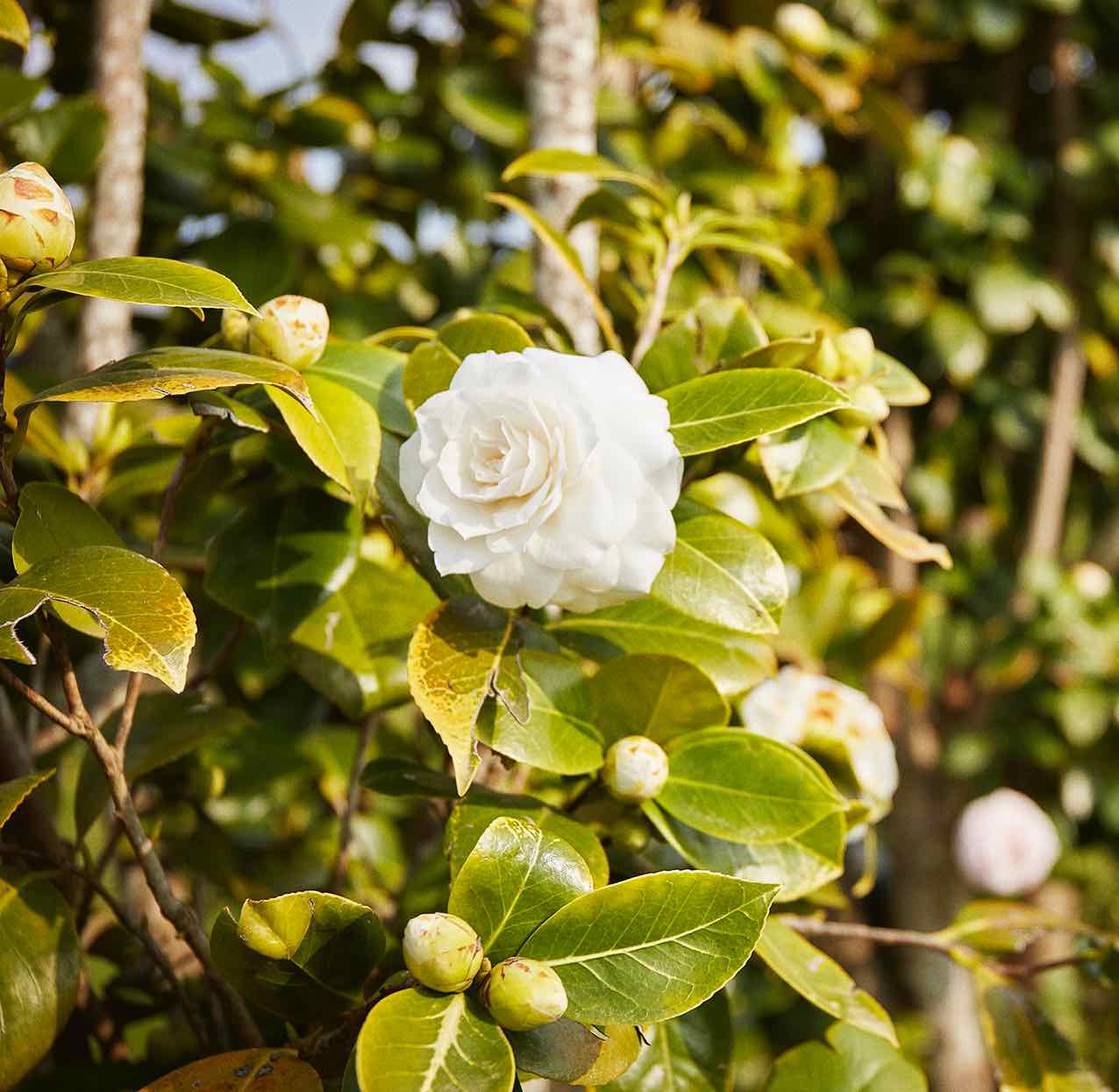 Le piante vivono in un ambiente biologico naturale, in sintonia le une con le altre. Le specie come la Achillea millefolium bianca, la Knautia arvensis e la Trifolium repens sono utilizzate per coprire il terreno, vivere e svilupparsi in sinergia con la Camellia japonica Alba Plena.
