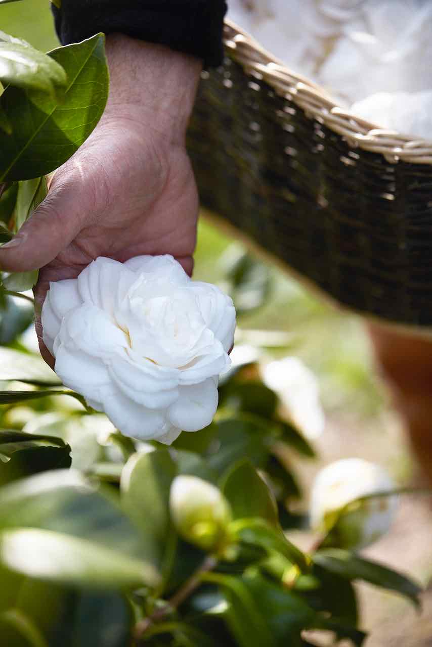 La fioritura della Camellia japonica comincia ai primi freddi di gennaio e raggiunge il suo apice a marzo. Questo fiore inodore così delicato è una forza della natura: né l’acqua né il freddo compromettono i suoi petali. Non c’è nessun bisogno di forzare il destino: “Qui tutto è naturale, in armonia con la natura. Noi la accompagniamo, senza cercare di controllarla”, spiega Philippe Grandry, Responsabile delle coltivazioni CHANEL nell’azienda agricola. Questo vale anche per la raccolta, eseguita interamente a mano. I fiori di camelia sono raccolti uno ad uno, dopo la scomparsa della rugiada del mattino, in modo che siano asciutti per un’estrazione ottimale. Poi vengono depositati all’interno di cesti. Dopo la pesatura, i fiori vengono immediatamente congelati per preservare l’integrità delle molecole attive prima di essere inviati in laboratorio.