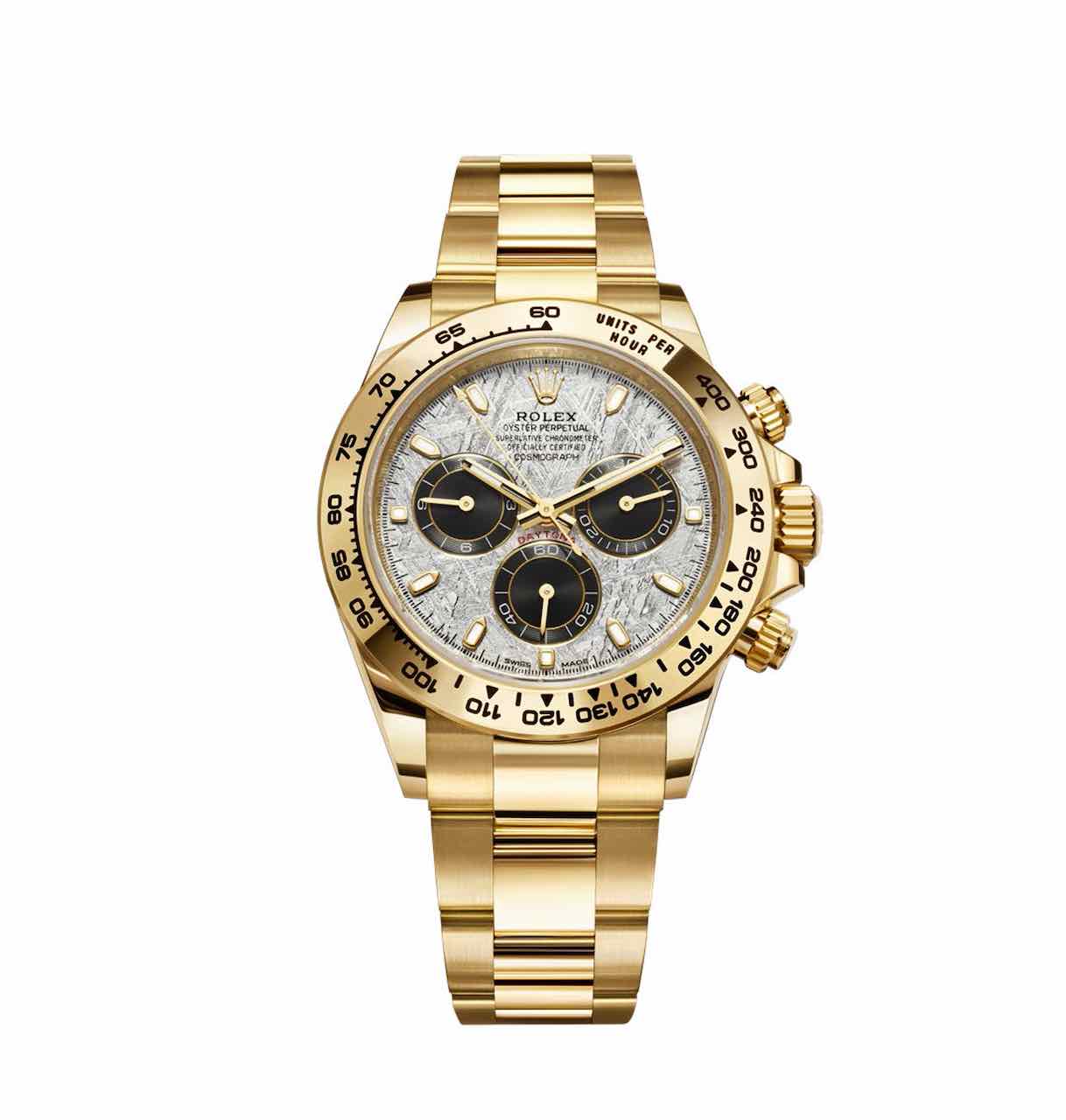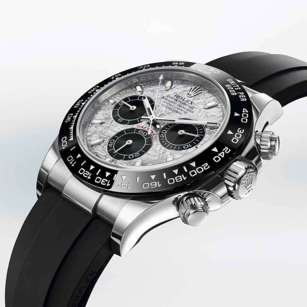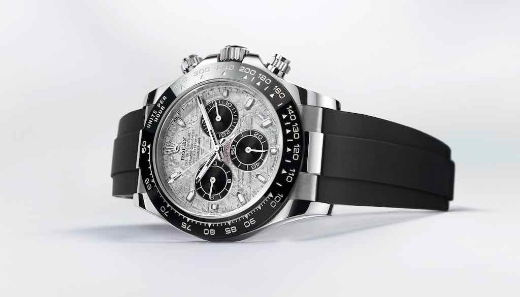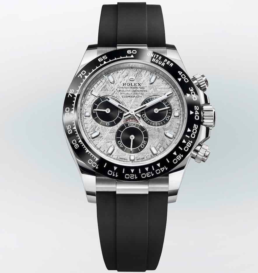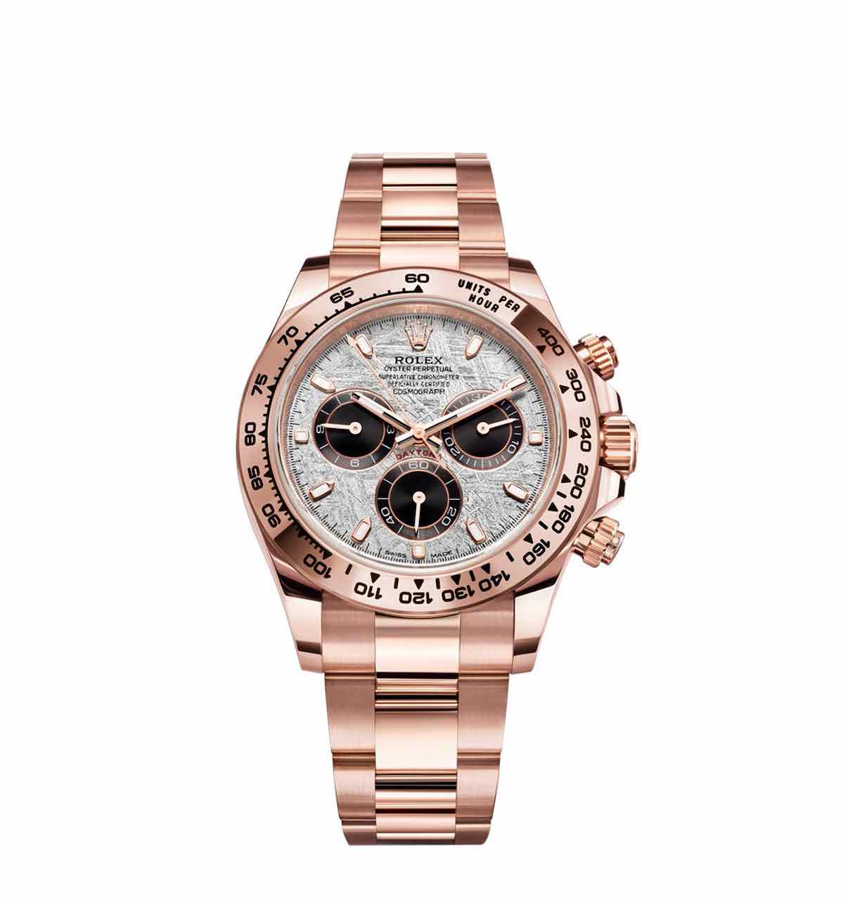 Rolex presenta tre declinazioni esclusive del suo Oyster Perpetual Cosmograph Daytona, l’orologio di riferimento degli appassionati di automobili e di velocità. Tutte e tre esibiscono un quadrante realizzato in meteorite metallica, un materiale naturale e raro proveniente dallo spazio, con contatori cronografici a ore 3, 6 e 9 di colore nero. La meteorite metallica è rara e difficile da lavorare: prima di tutto si ricavano delle lamine sottili, poi, mediante un trattamento chimico, si rivela tutta la bellezza della sua struttura interna che ricorda lampi di luce intrecciati. Questi motivi, tanto imprevedibili quanto affascinanti, sono chiamati “figure di Widmanstätten”. Per i suoi quadranti in meteorite, Rolex collabora con gli esperti più accreditati e sceglie esclusivamente le lamine con una superficie particolarmente ricca di forme e riflessi.