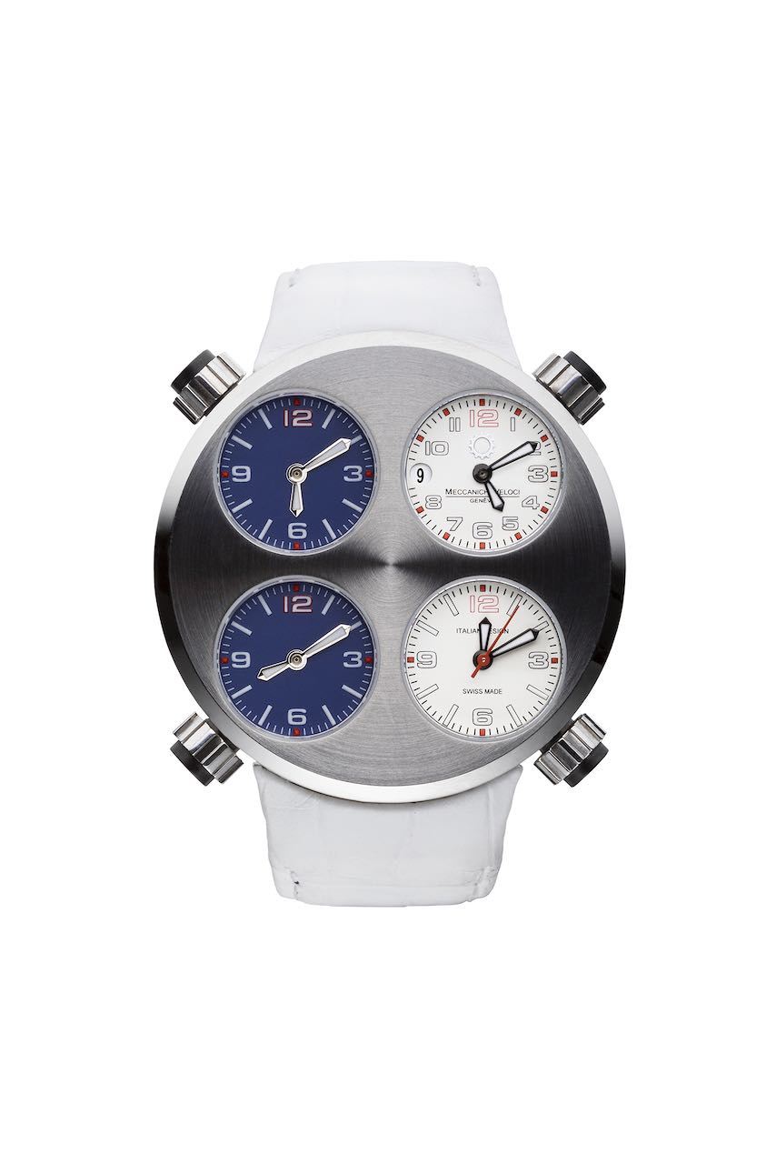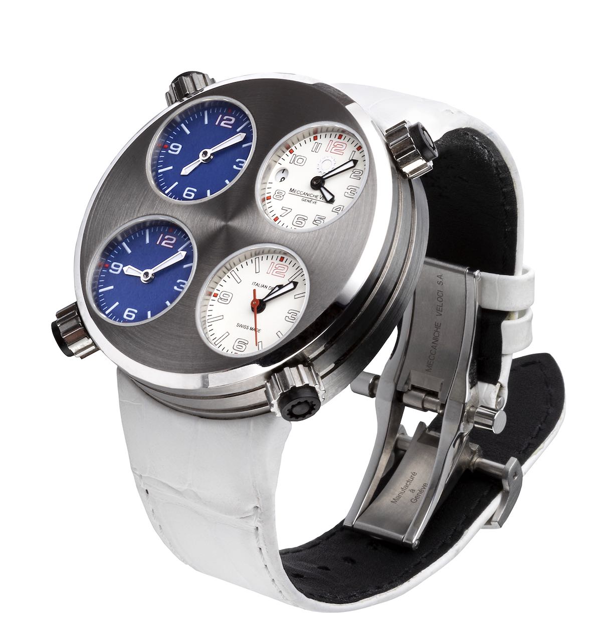 La caratteristica cassa a forma di pistone di 49 millimetri del modello Icon GranTurismo è in titanio naturale spazzolato. I quattro quadranti – che indicano altrettanti fusi orari – sono divisi in due “zone” per via dei due colori scelti, blu corsa e bianco, a ricordare la livrea delle auto sportive. L’audace effetto estetico diventa simbolo di un’elegante contrasto. Sui quadranti spiccano i dettagli rossi della lancetta dei secondi e delle ore 12 del quadrante principale che propone anche la finestrella per la lettura della data. Icon GranTurismo è animato dal calibro di manifattura MV 8802 che gestisce simultaneamente i quattro fusi orari, indicando ore e minuti, oltre alla funzione data e secondi. Le funzioni di ogni singolo quadrante sono regolate attraverso le corone poste in corrispondenza degli stessi. Il movimento è visibile grazie al fondello aperto.
