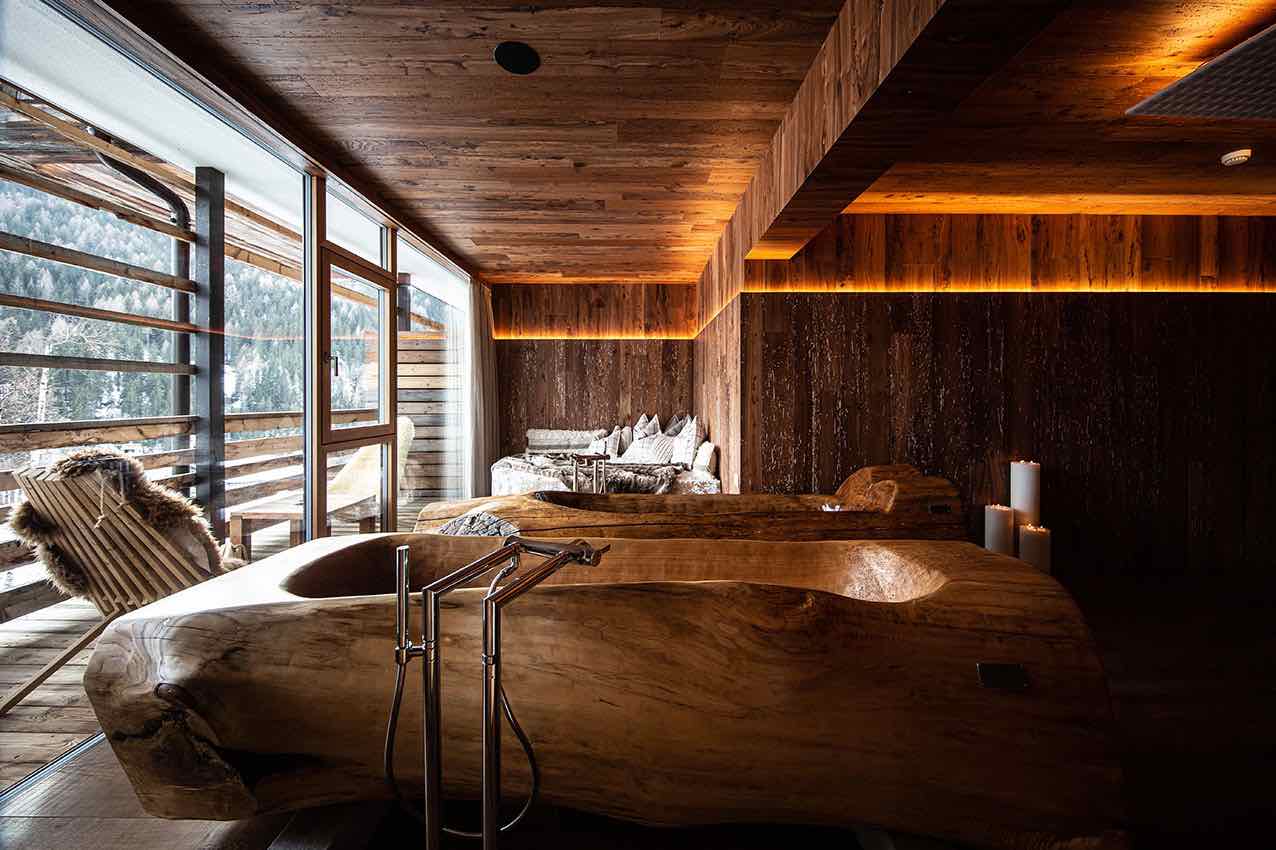 Benessere a 360° nei 3.000 mq di area wellness con diversi tipi di saune, bagno turco, bagno sole, sanarium, idromassaggio con acqua salina; inoltre piscine coperta e esterna, infinity pool di 25 metri su terrazza panoramica. L’ampia offerta di massaggi e trattamenti è arricchita dai nuovi ambienti Spa: 12 nuove suite fra cui Aemotio Spa con particolare lettino ad acqua riscaldato e due Fanes Private Suite, esclusive e spaziose cabine trattamento dove vivere un paio d’ore indimenticabili con la propria dolce metà. La suite Regno del Cirmolo è una pura immersione nel benessere di tradizione alpina: gli interni in caratteristico legno di cirmolo diffondono un gradevole e benefico profumo nella stanza, che comprende anche sauna al fieno e all’esterno vasca salina circolare. Caratteristiche della suite Regno del Fanes sono invece ampio bagno turco e due originali vasche da bagno ricavate ciascuna da un unico tronco di castagno, per fare un bagno al siero di latte, di vinaccioli o di oli aromatici all’interno di una autentica opere d’arte. Interamente dedicata al trattamento di punta è invece la stanza Caveau, dal design raffinato sui colori nero e oro, che richiama i prodotti dell’omonima linea cosmetica, naturali rimpolpanti e anti-aging, una vera cura per la pelle.