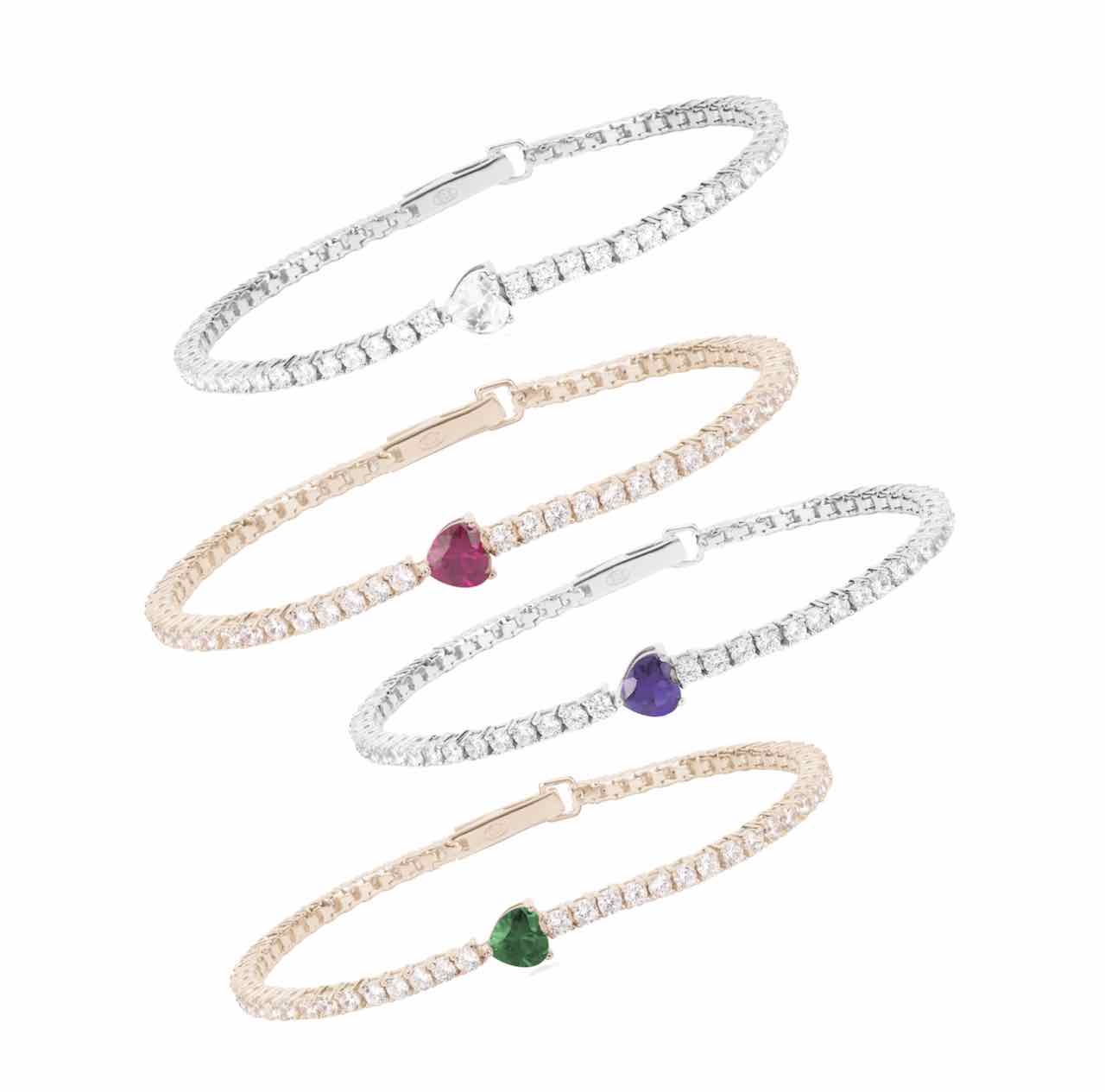 Mabina Gioielli presenta una linea inedita di bracciali d’argento 925. Si tratta del bracciale tra i più tradizionali: il tennis. Il centro di questo gioiello di Mabina Gioielli è uno zircone colorato taglio a cuore, elegante quanto splendente, del diametro di 2,5 mm. I cuori di zircone verde e rosso sono abbinati all’argento 925 rosato e ad una fila di zirconi bianchi.
