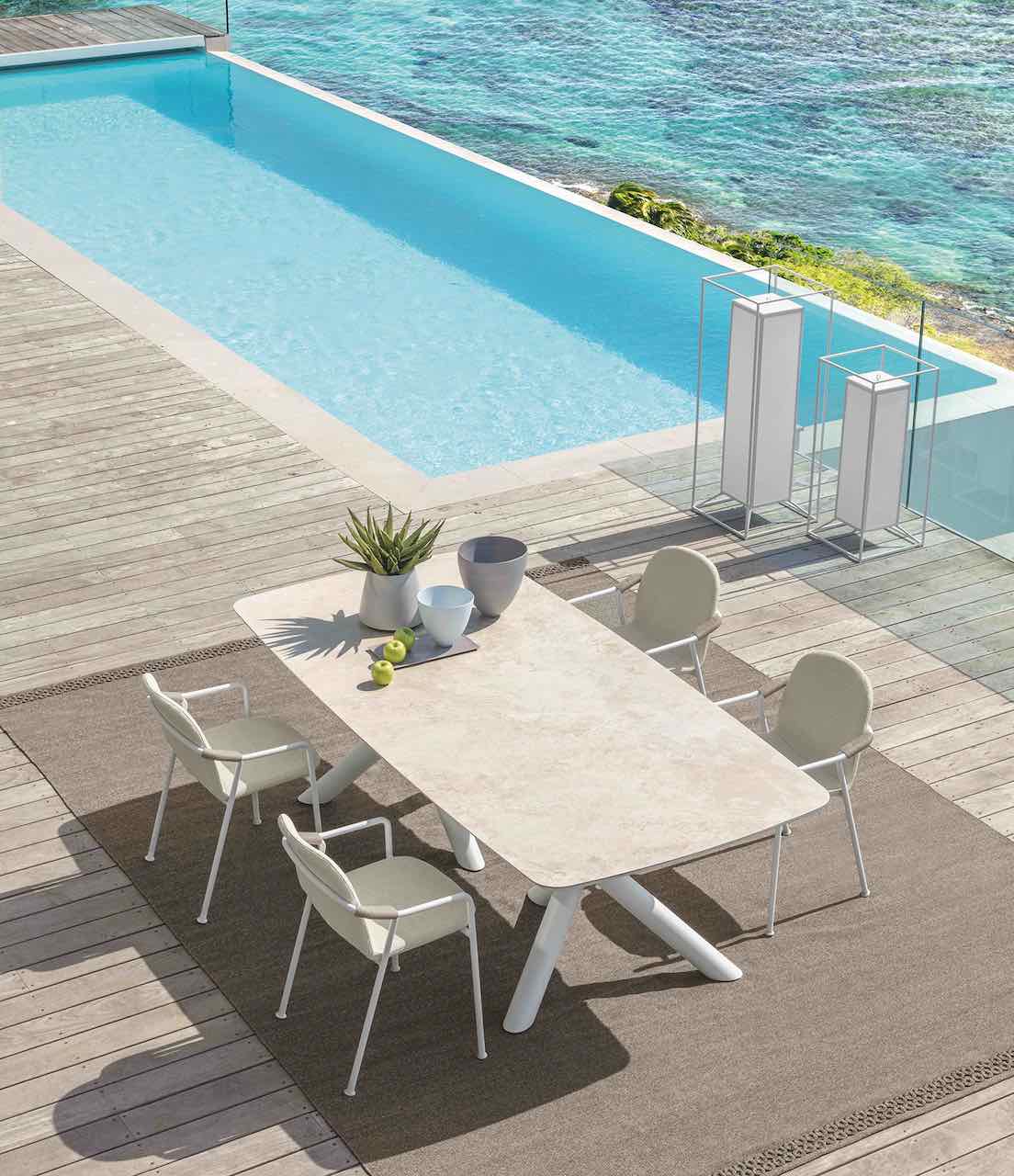 Il gioco dei contrasti caratterizza anche il tavolo da pranzo, l’alleato perfetto per i propri momenti di convivialità negli spazi dell’outdoor. Il pianale in grès porcellanato, dialogando con le zampe in alluminio, trasformano questo tavolo in un vero e proprio gioiello di design per l’outdoor, capace di donare nuovo valore ad ogni spazio. La collezione Coral comprende anche poltrone e tavoli da bar, tavoli da caffè, side table e lettini, oltre a pouf ottoman e poltrone da pranzo. Per ogni elemento della nuova linea di Talenti, il minimo comun denominatore è sempre lo stesso: l’amore per la bellezza impareggiabile del Made in Italy, del design e del miglior arredamento per Outdoor.